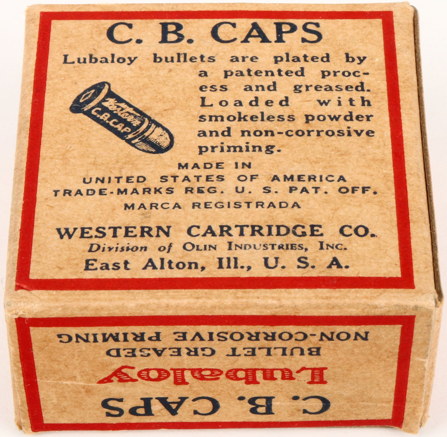 Western, C.B. Caps, Bullet Greased, RHWeb: WCC-99 CB-1e, Full, 1pc. Buff box with red & black printing, box is solid with excellent to minty color, very minor corner wear, edges are crisp, top flaps are solid, ammo is excellent. Grade: Excellent + - Value: 20 to 80