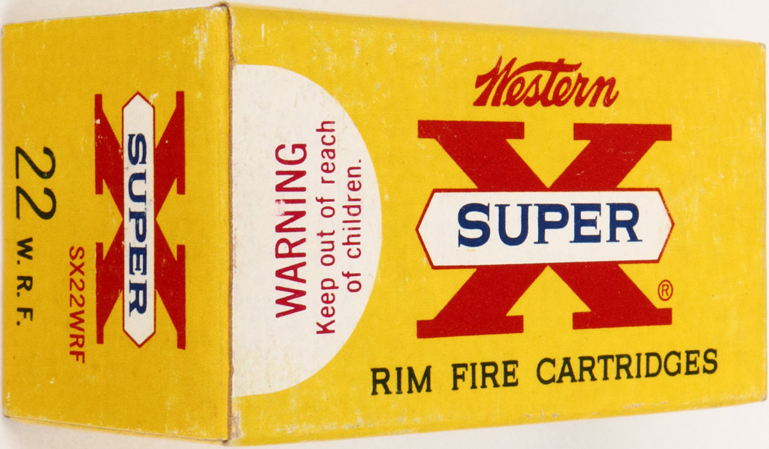 Western, Super-X, .22 W.R.F., RHWeb: WCC-12 WRF-1b, Full, 1pc. Yellow white & red box, box is mint with minty color, very sharp corners, very crisp edges, very rigid end flaps, ammo is excellent to minty. Grade: Mint - Value: 10 to 50
