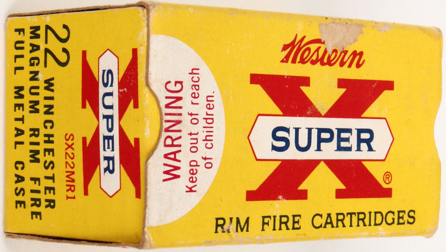 Western, Super X, .22 Winchester Magnum Rim Fire, RHWeb: WCC-12 WMR-3, Full, 1pc. Yellow white & red box, box is solid with excellent color, minor age soiling, small scuff to top, very minor edge & corner wear, end flaps are solid, ammo is very good to excellent. Grade: Excellent - Value: 10 to 50