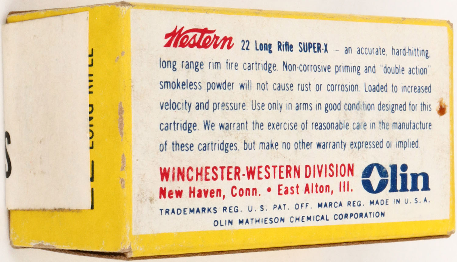 Western, Super X, .22 Long Rifle Action Proving Dummy Cartridges, RHWeb: WCC-12 LR-6, FULL & SEALED, 1pc. Yellow white & red box with white over label, box is solid with excellent color, very minor edge & corner wear. Grade: Excellent ++ - Value: 6 to 30