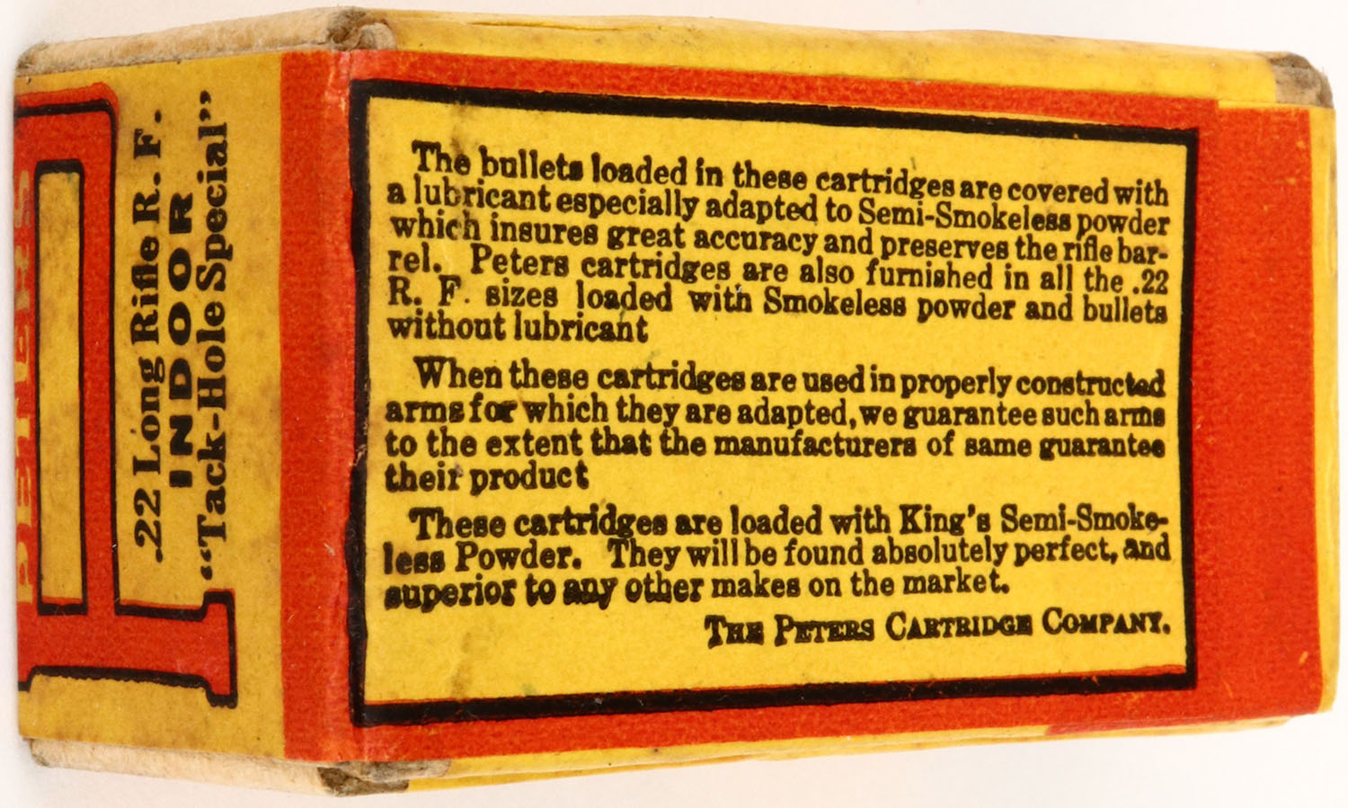 Peters, .22 Long Rifle ''Tack-Hole Special'' Indoor, Semi-Smokeless Powder, RHWeb: PCC-52 LR-5, FULL & SEALED, 2pc. Buff box with yellow & red wraparound side & end label, box is solid with excellent color, some age soiling, very minor corner wear, edges are crisp. Grade: Excellent ++ - Value: 100 to 400