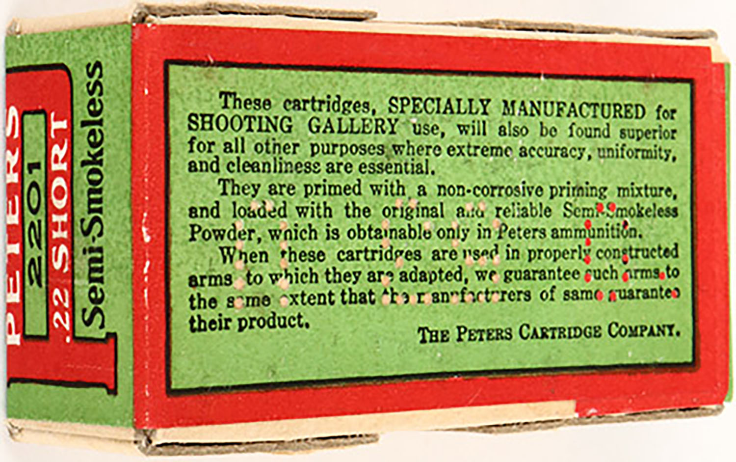 Peters, .22 Short, Semi-Smokeless Powder, RHWeb: PCC-5B S-1c, Full & Sealed, 2pc. Buff box with green & red wraparound label, box is mint with mint color, corners are very sharp, edges are crisp. Grade: Mint - Value: 40 to 120