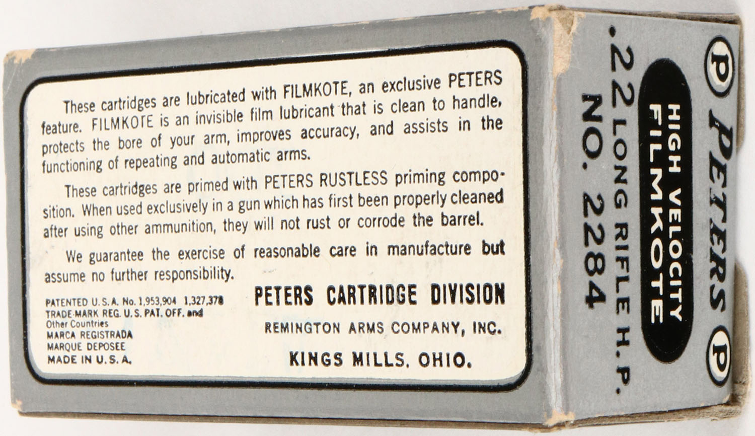 Peters, High Velocity Filmkote, .22 Long Rifle, RHWeb: PCC-13 LR-2g, Full, 1pc. Silver black & white box, box is solid with excellent to minty color, minor corner wear, edges are mostly crisp, end flaps are rigid, ammo is excellent. Grade: Excellent ++ - Value: 10 to 50