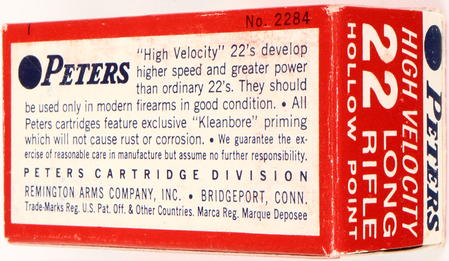 Peters, ''Golden Bullet'', .22 Long Rifle Hollow Point, RHWeb: PCC-20 LR-2, Full, 1pc. Red white & blue box, box is solid with excellent color, some shelf & corner wear, edges are crisp, end flaps are solid, ammo is very good to excellent. Grade: Excellent - Value: 2 to 20