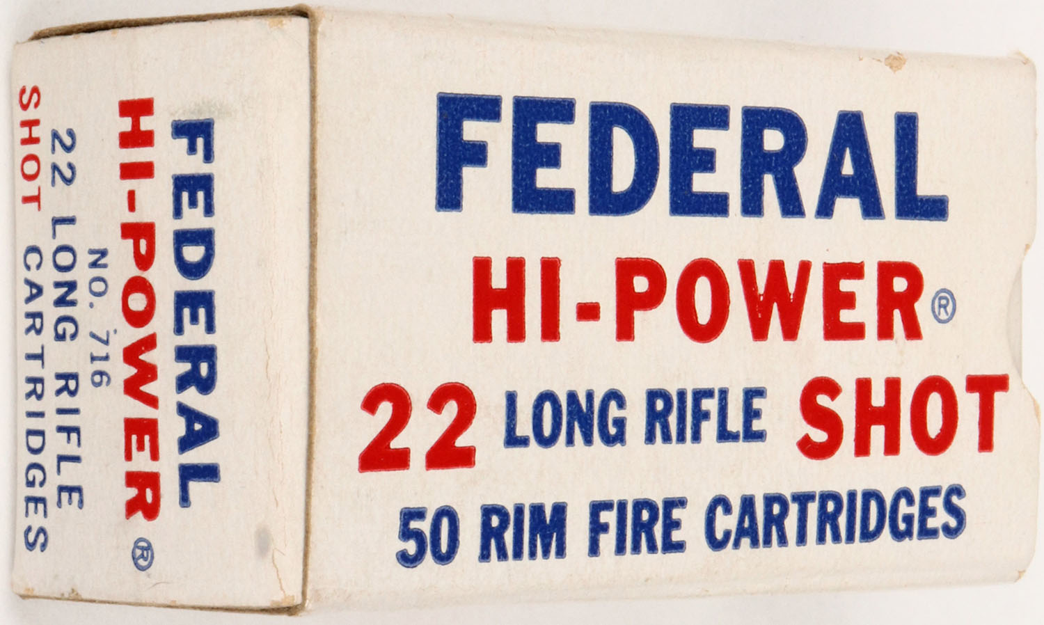 Federal, Hi-Power, .22 Long Rifle Shot, RHWeb: FED-8 LR-5a, Partial 43rds., 1pc. White blue & red box, box is solid with excellent color, very minor age soiling, corners are mostly sharp, edges are crisp, end flaps are rigid, ammo is excellent. Grade: Excellent ++ - Value: 2 to 40