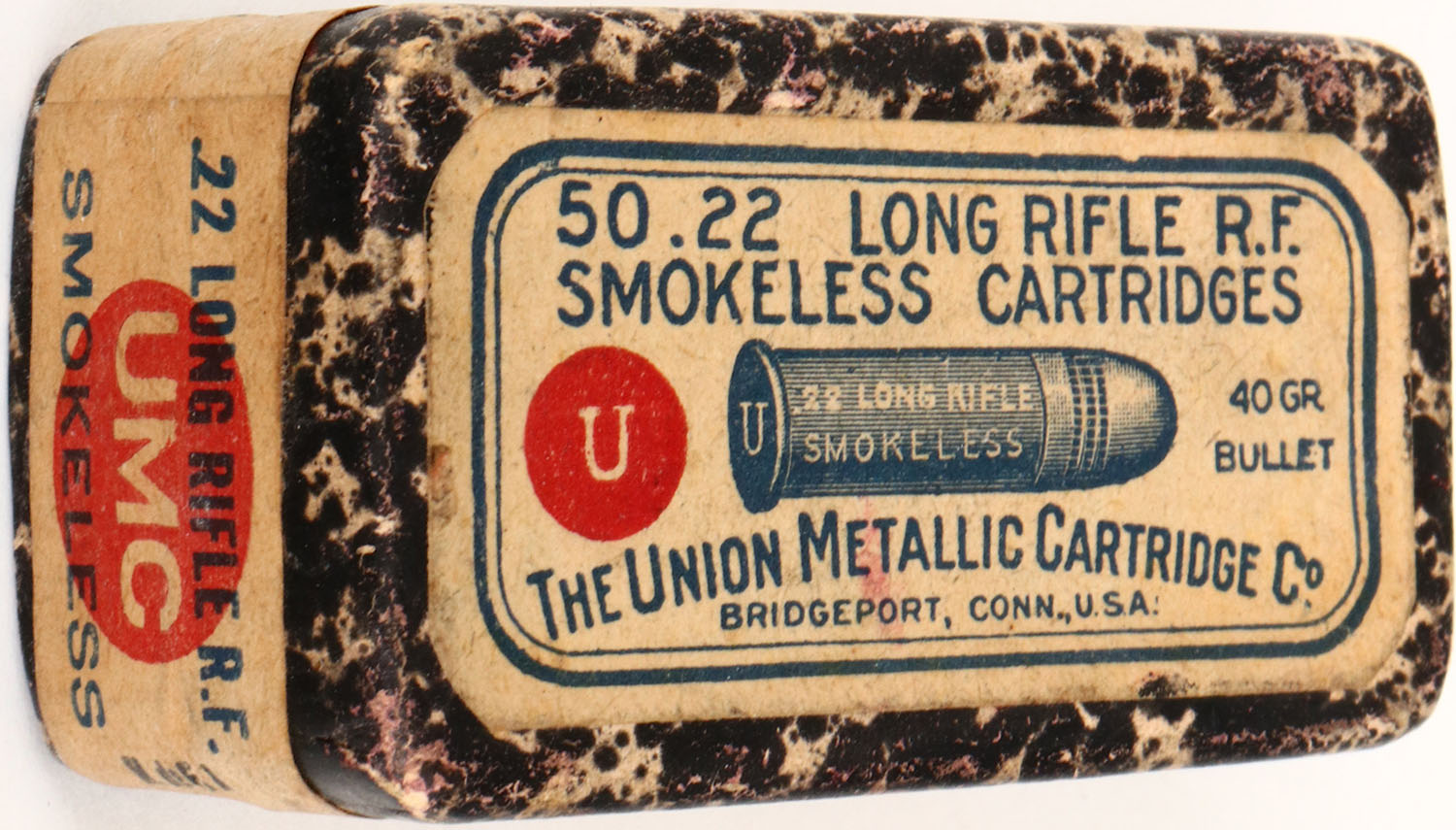 UMC, .22 Long Rifle, Smokeless Cartridges, RHWeb: UMC-9 LR-3, FULL & SEALED, 2pc. Black mottled box with buff top & side sealing labels, box is near mint with minty color, very minor shelf wear on bottom, edges are crisp, labels are intact. Grade: Excellent ++ - Value: 50 to 150