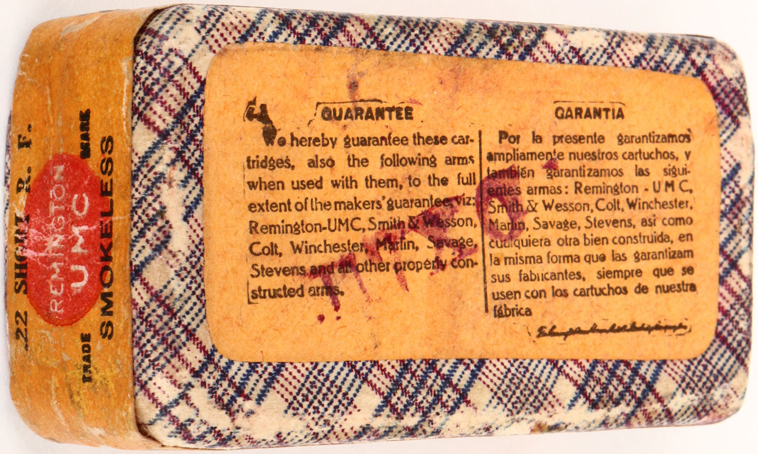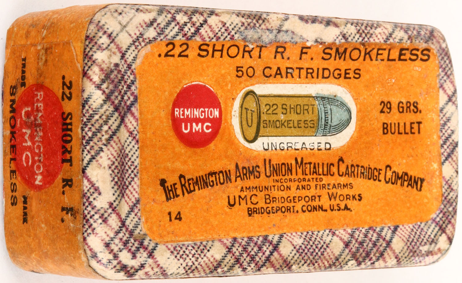 REM-UMC, .22 Short, Smokeless, Ungreased, RHWeb: REM-2 S-5B, FULL & SEALED, 2pc. Purple fabric box with orange top & side sealing labels, box is solid with excellent color, minor age soiling, very minor edge wear, labels are intact. Grade: Excellent ++ - Value: 30 to 120