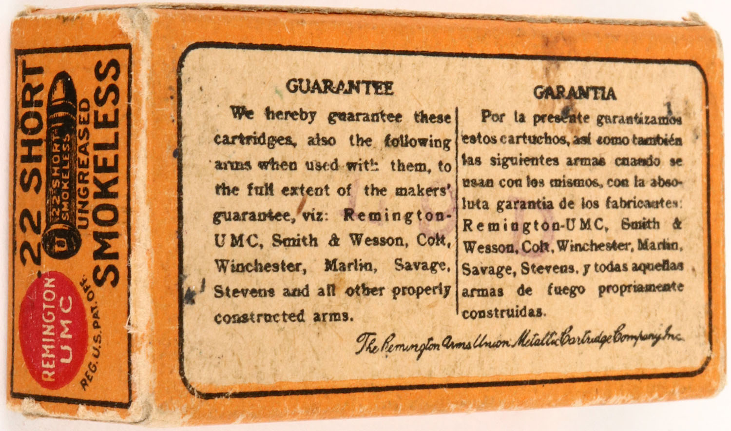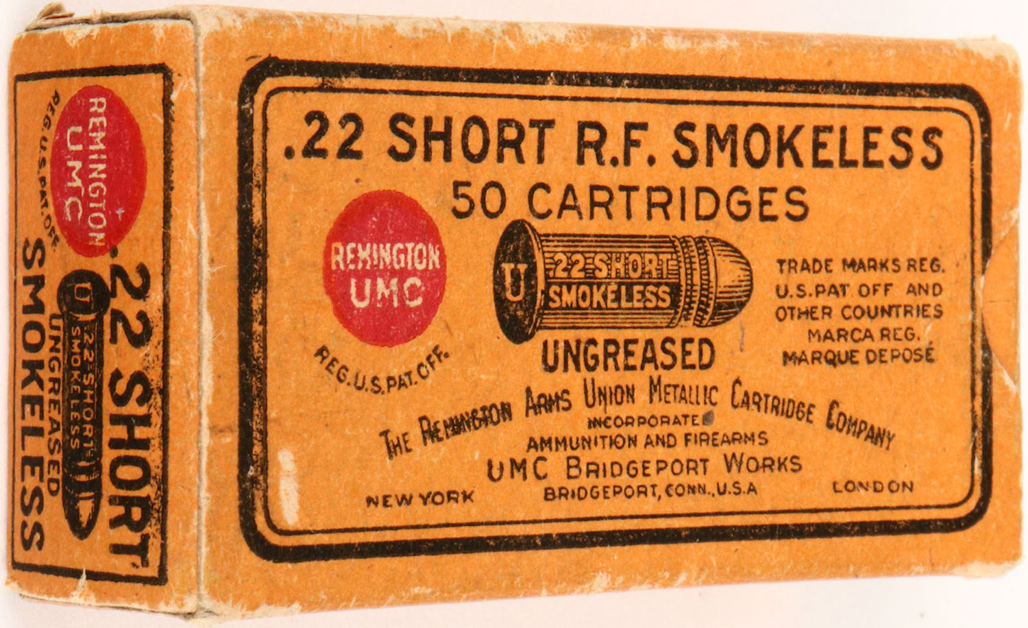 REM-UMC, .22 Short, Smokeless, Ungreased, RHWeb: REM-4 S-5, Full, 1pc. Orange & black box, box is solid with excellent color, very minor edge & corner wear, end flaps are solid, ammo is excellent. Grade: Excellent + - Value: 10 to 50