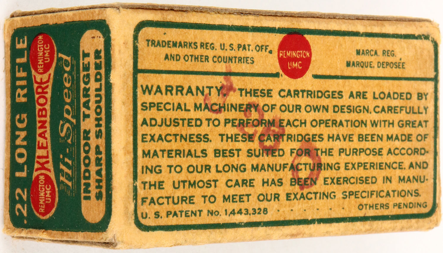 Remington, Kleanbore, .22 Long Rifle, Indoor Target, RHWeb: REM-69 LR-1b, Full, 1pc. Green & buff dogbone box, box is solid with excellent color, very minor age soiling, minor corner wear, edges are mostly crisp, end flaps are rigid, ammo is excellent. Grade: Excellent ++ - Value: 20 to 80
