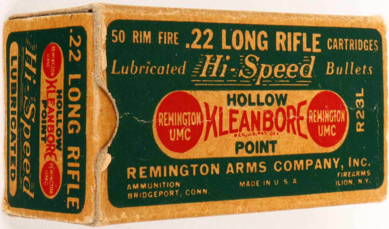 Remington, Kleanbore, .22 Long Rifle Hollow Point, Hi-Speed, RHWeb: REM-7.4 LR-3e, Full, 1pc. Green & buff dogbone box, box is solid with excellent color, very minor edge wear on end flaps, very minor corner wear, edges are mostly crisp, end flaps are rigid, ammo is excellent. Grade: Excellent ++ - Value: 10 to 50