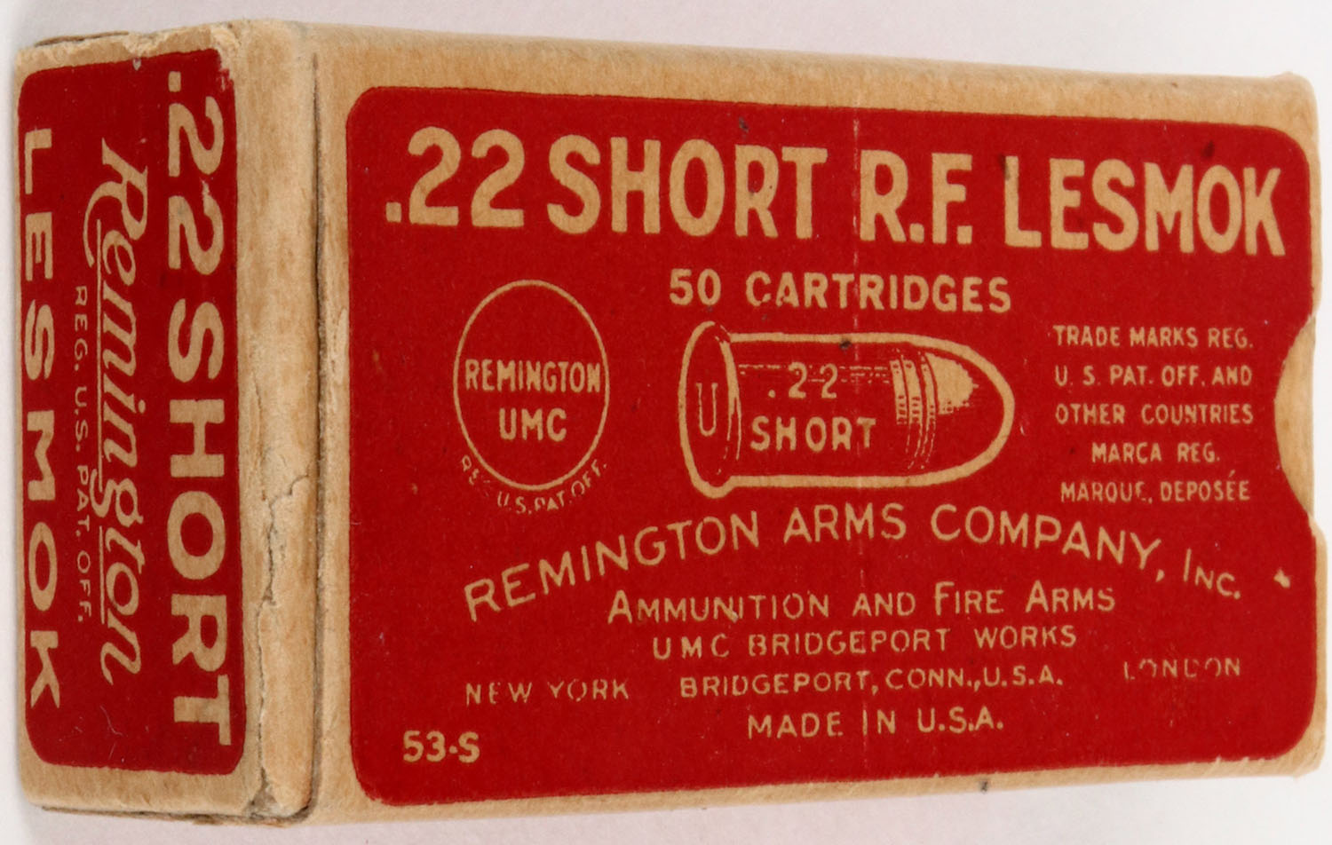 Remington, .22 Short, R.F. Lesmok, RHWeb: REM-6 S-2.1A, Full, 1pc. Red & buff box, box is solid with excellent color, very minor age soiling & corner wear, edges are mostly crisp, end flaps are solid, ammo is very good. Grade: Excellent + - Value: 6 to 30