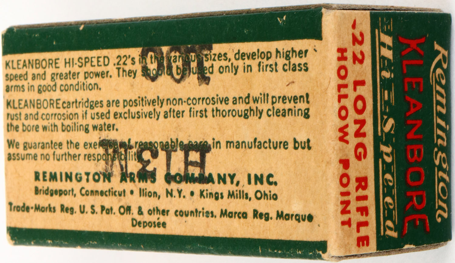 Remington, Kleanbore, .22 Long Rifle, Hi-Speed, RHWeb: REM-10 LR-2a, Full, 1pc. Green white & red box, box is solid with excellent color, very minor corner & edge wear, end flaps are rigid, ammo is excellent. Grade: Excellent ++ - Value: 6 to 30