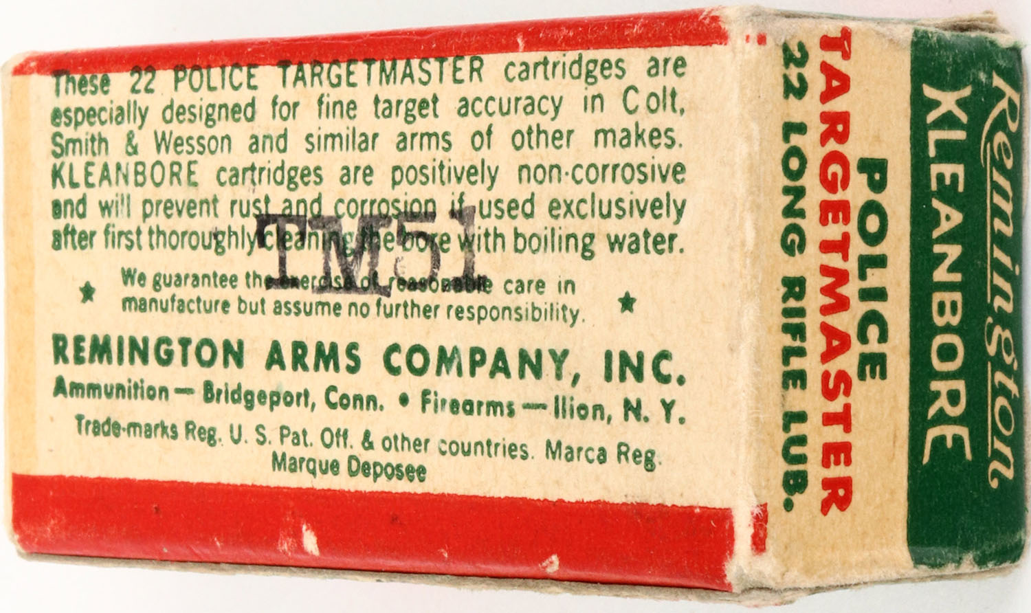 Remington, Police Targetmaster, .22 Long Rifle, Kleanbore, RHWeb: REM-69 LR-2d, Full, 1pc. Green white & red box, box is solid with excellent color, minor corner wear, edges are mostly crisp, end flaps are rigid, ammo is excellent. Grade: Excellent + - Value: 10 to 50