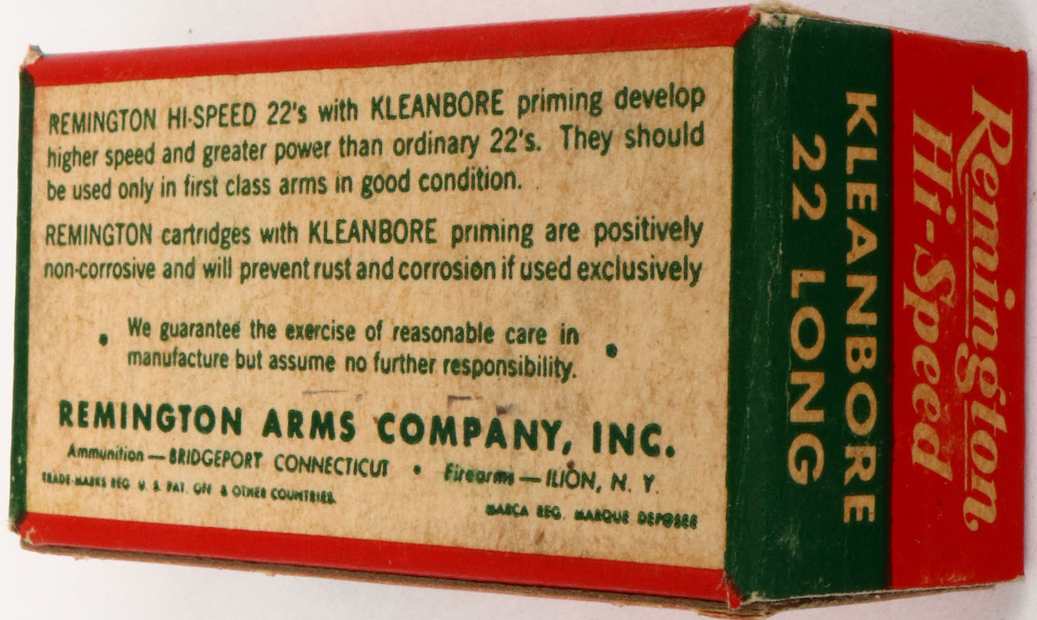 Remington, Hi-Speed Kleanbore, .22 Long, RHWeb: REM-14 L-1b, Full, 1pc. Red & green box, box is solid with excellent color, minor age soiling, very minor corner wear, edges are crisp, end flaps are solid, ammo is excellent. Grade: Excellent ++ - Value: 4 to 20