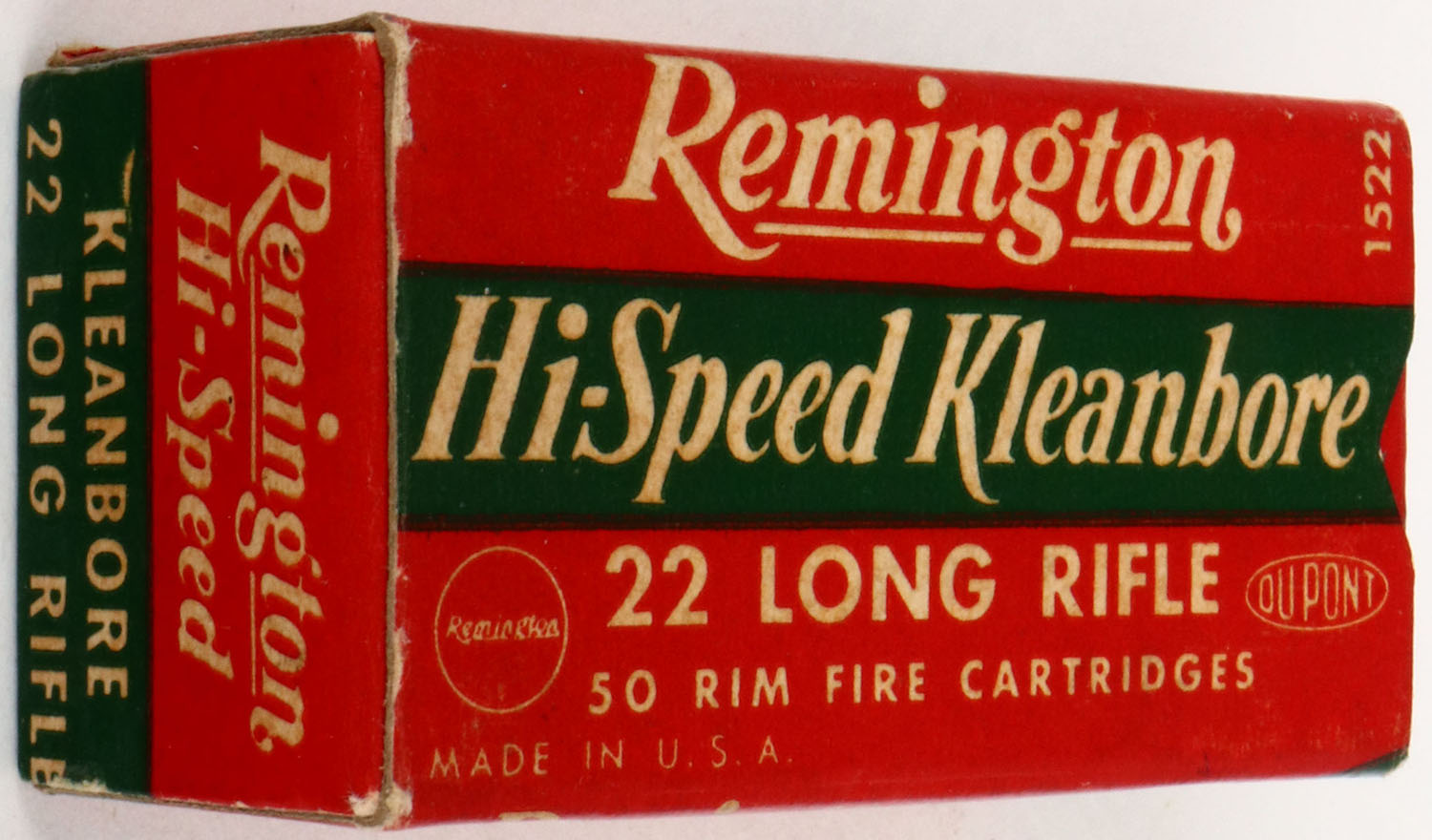 Remington, Hi-Speed Kleanbore, .22 Long Rifle, RHWeb: REM-14 LR-1, Full, 1pc. Red green & white box, box is solid with excellent color, minor age soiling, very minor edge & corner wear, end flaps are solid, ammo is excellent. Grade: Excellent ++ - Value: 4 to 20