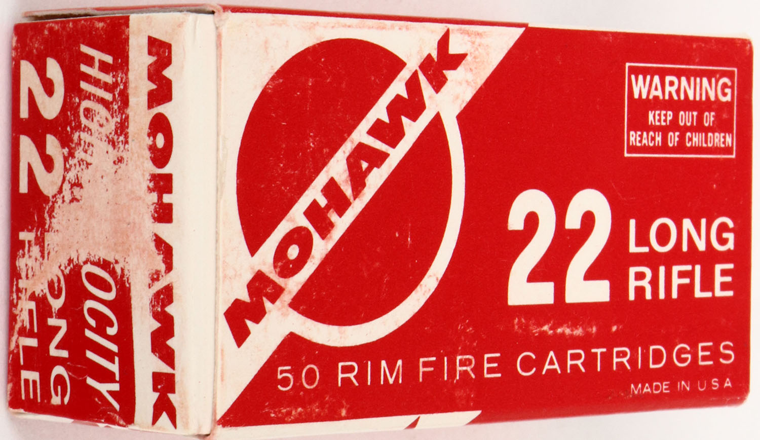 Remington, Mohawk, .22 Long Rifle, High Velocity, RHWeb: REM-30 LR-1, Full, 1pc. Red & white box, box is solid with excellent color, some shelf wear, scuff to left end, some shelf wear, very minor corner wear, edges are crisp, end flaps are solid, ammo is excellent. Grade: Excellent + - Value: 6 to 30