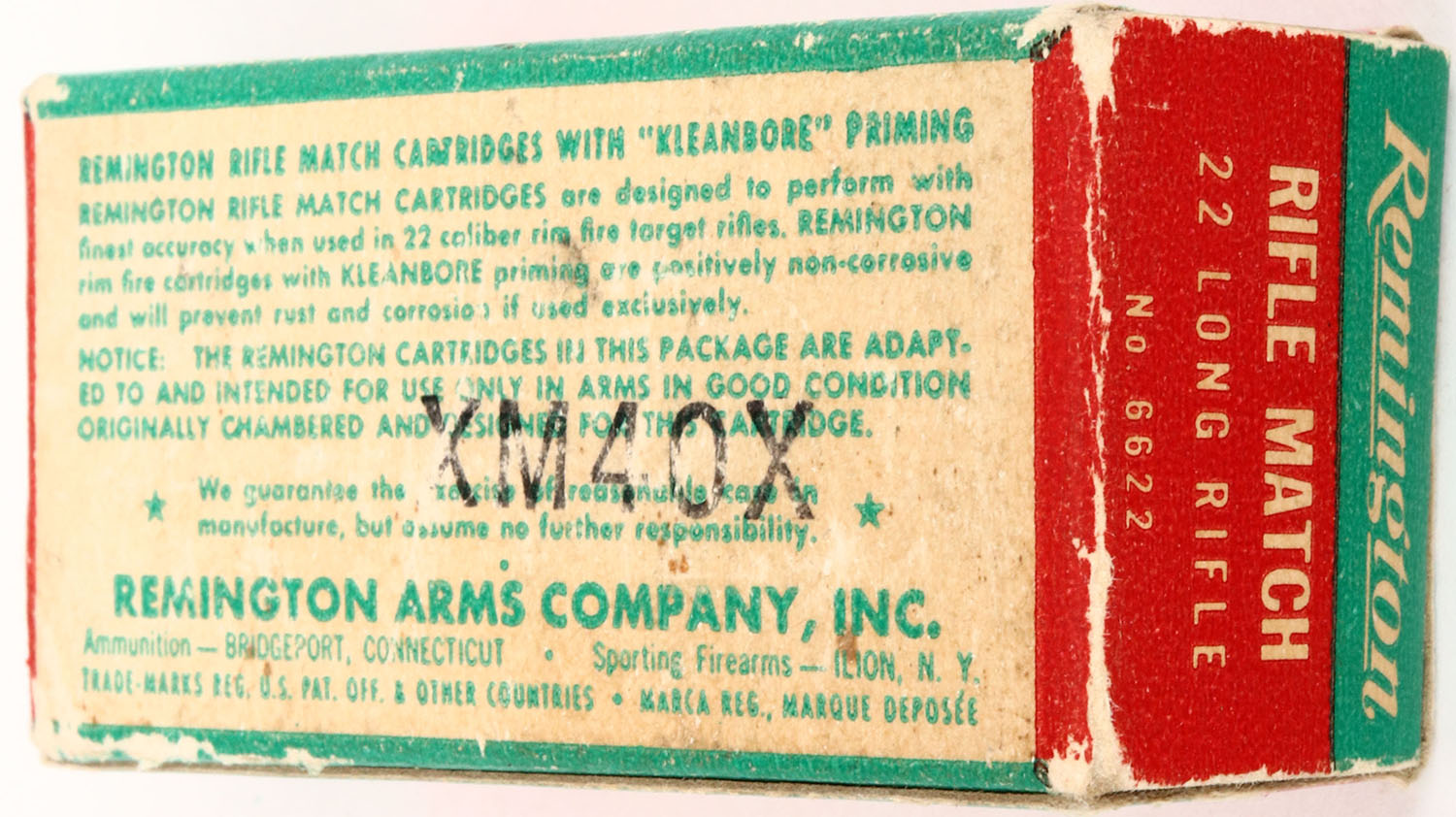 Remington, Rifle Match, .22 Long Rifle, Kleanbore, RHWeb: REM-54 LR-3c, Full, 1pc. Green red & white box, box is solid with excellent color, minor age soiling & edge wear, very minor corner wear, end flaps are rigid, ammo is excellent. Grade: Excellent + - Value: 6 to 30