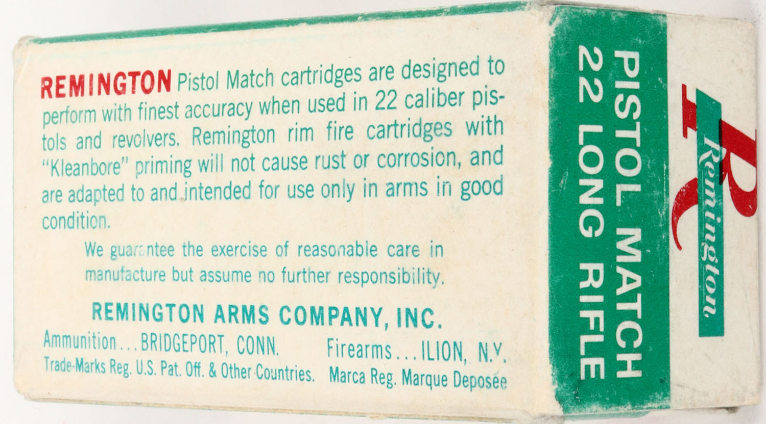 Remington, Pistol Match, .22 Long Rifle, Kleanbore, RHWeb: REM-54 LR-11b, Full, 1pc. White & green box, box is solid with excellent color, very minor age soiling, small stain on top, very minor corner wear, edges are crisp, end flaps are rigid, ammo is very good to excellent. Grade: Excellent - Value: 2 to 20