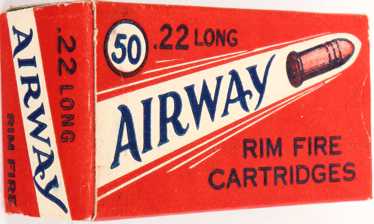 Gamble's, Airway, .22 Long, RHWeb: GS-1 L-1c, Full, 1pc. Red blue & white box, box is MINT with minty color, corners are sharp, edges are crisp, end flaps are solid, ammo is excellent. Grade: MINT - Value: 30 to 90