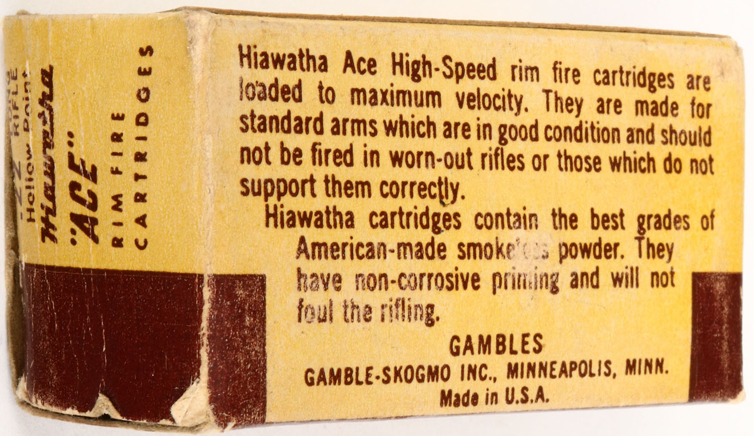 Gamble Stores, Hiawatha ''ACE'', .22 Long Rifle Hollow Point, RHWeb: GS-4 LR-2, Full, 1pc. Brown & yellow box, box is solid with very good color, shelf wear, very minor edge & corner wear, right end flap is bent, end flaps are mostly rigid, ammo is excellent. Grade: Excellent - Value: 6 to 30
