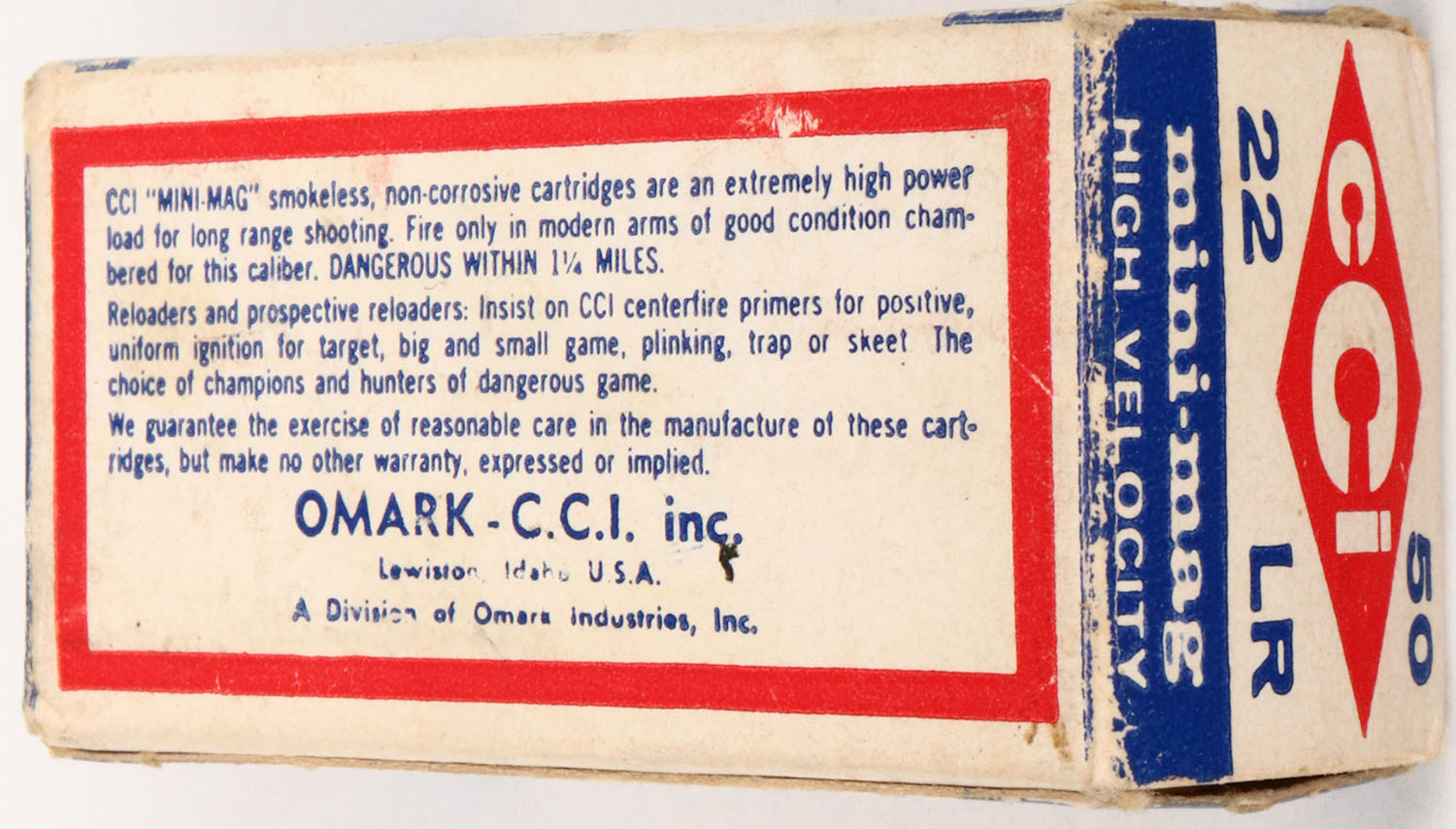 CCi, mini-mag, .22 Long Rifle, High Velocity, RHWeb: CCI-2 LR-1e, Full, 1pc. White blue & red box, box is solid with excellent color, minor age soiling & corner wear, very minor edge wear, end flaps are solid, ammo is excellent. Grade: Excellent + - Value: 4 to 20