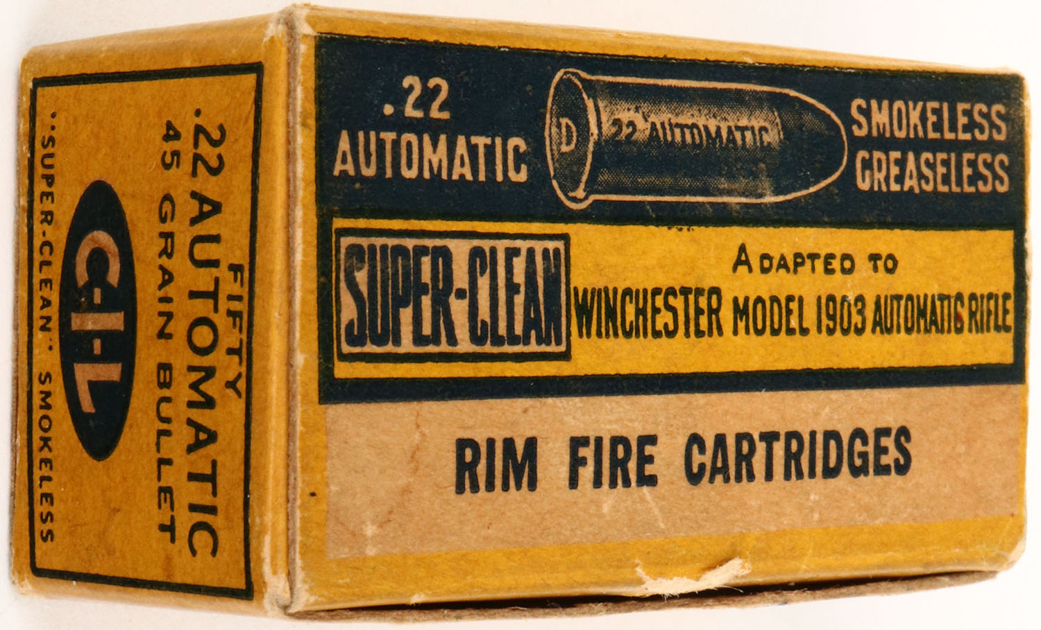 C.I.L., Super-Clean, .22 Automatic, Smokeless Greased, RHWeb: CIL-4 WA-1, Full, 1pc. Buff yellow & blue box, box is solid with excellent color, very minor age soiling & edge wear, corners are mostly sharp, top flap is solid, ammo is minty. Grade: Excellent ++ - Value: 30 to 120
