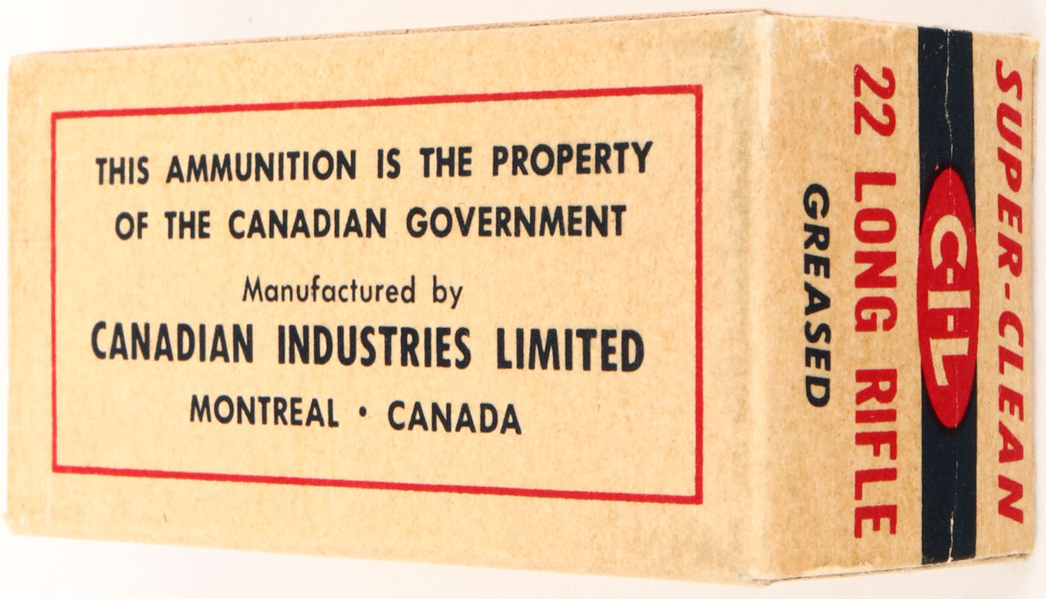 C.I.L., Super-Clean, .22 Long Rifle, Standard Velocity, RHWeb: CIL-3 LR-4, Full, 1pc. Buff & blue box, box is solid with excellent to minty color, one small corner ding on top back corner, corners otherwise sharp, edges are crisp, end flaps are solid, ammo is very good to excellent. Grade: Excellent ++ - Value: 8 to 40
