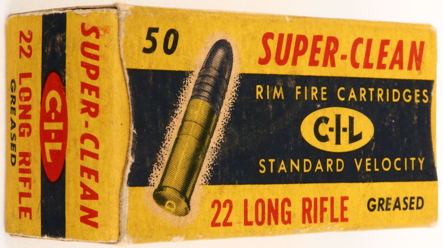 C.I.L., Super-Clean, .22 Long Rifle, Standard Velocity, RHWeb: CIL-4 LR-4, Full, 1pc. Yellow blue & red box, box is solid with very good to excellent color, some age soiling, very minor corner wear, edges are mostly crisp, end flaps are solid, ammo is very good. Grade: Excellent + - Value: 4 to 20
