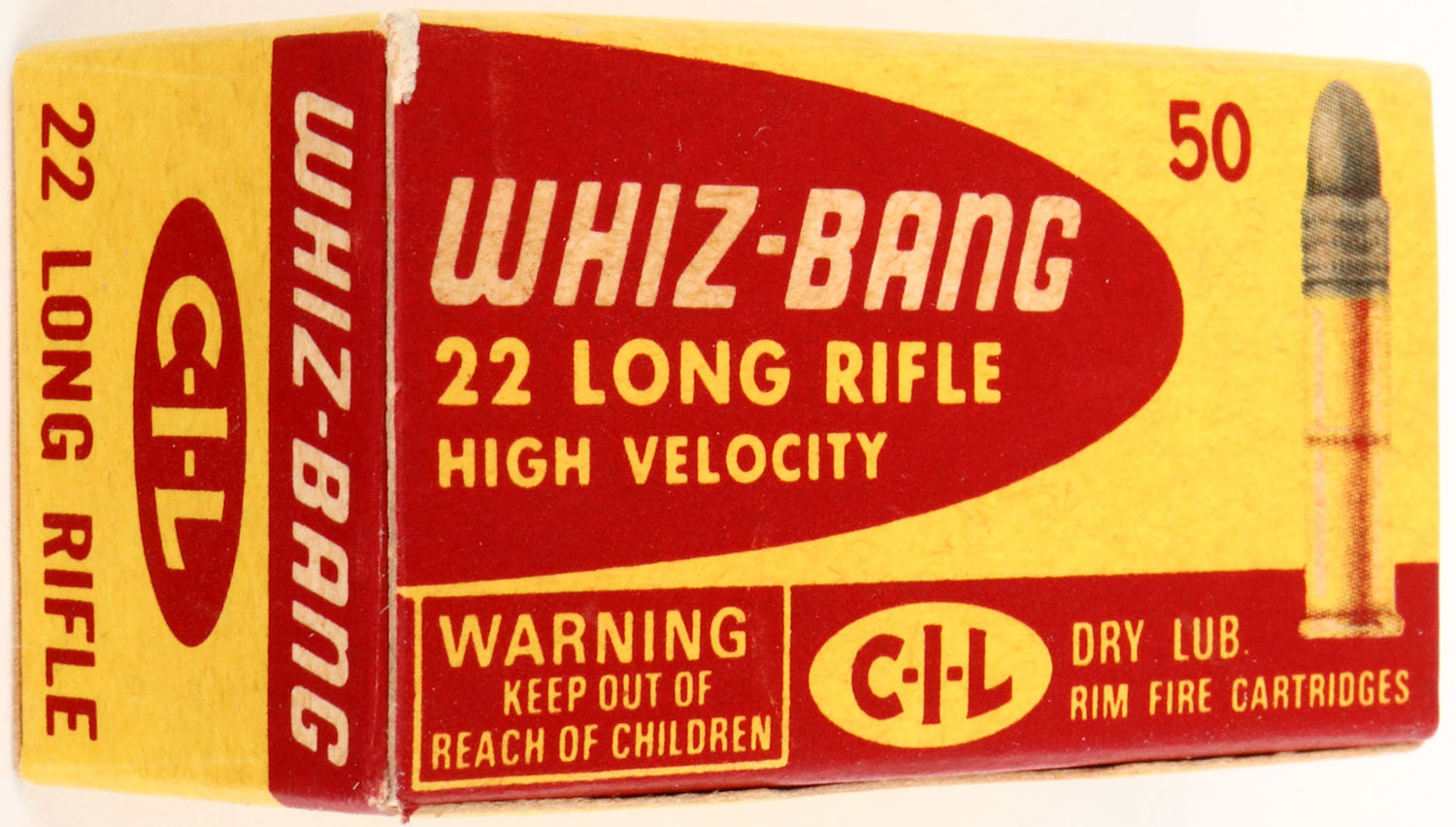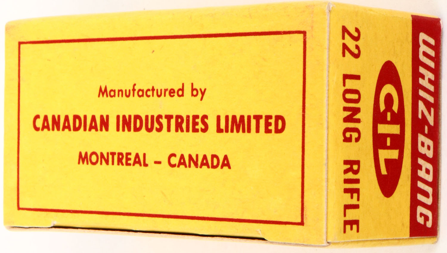 C.I.L., Whiz-Bang, .22 Long Rifle, High Velocity, RHWeb: CIL-6 LR-1b, Full, 1pc. Yellow & red box, box is minty with minty color, corners are sharp, edges are crisp, top flap is solid, ammo is excellent to minty. Grade: MINT - Value: 8 to 40