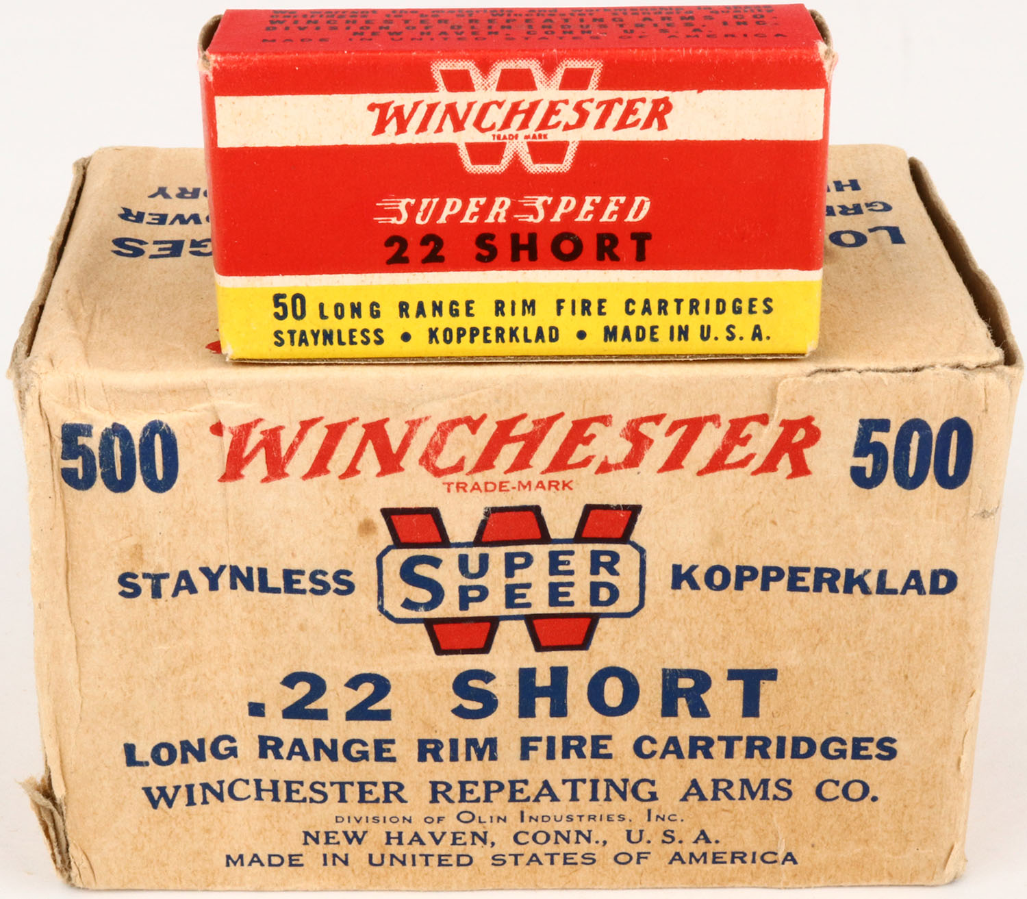 Winchester, .22 Short, Staynless Kopperklad, Full, 500rds. 1pc. Buff brick with blue & red printing, left end flap is torn, brick has excellent color with minor corner wear, very minor edge wear, inside boxes are excellent to minty. Grade: Very Good ++ - Value: 40 to 120