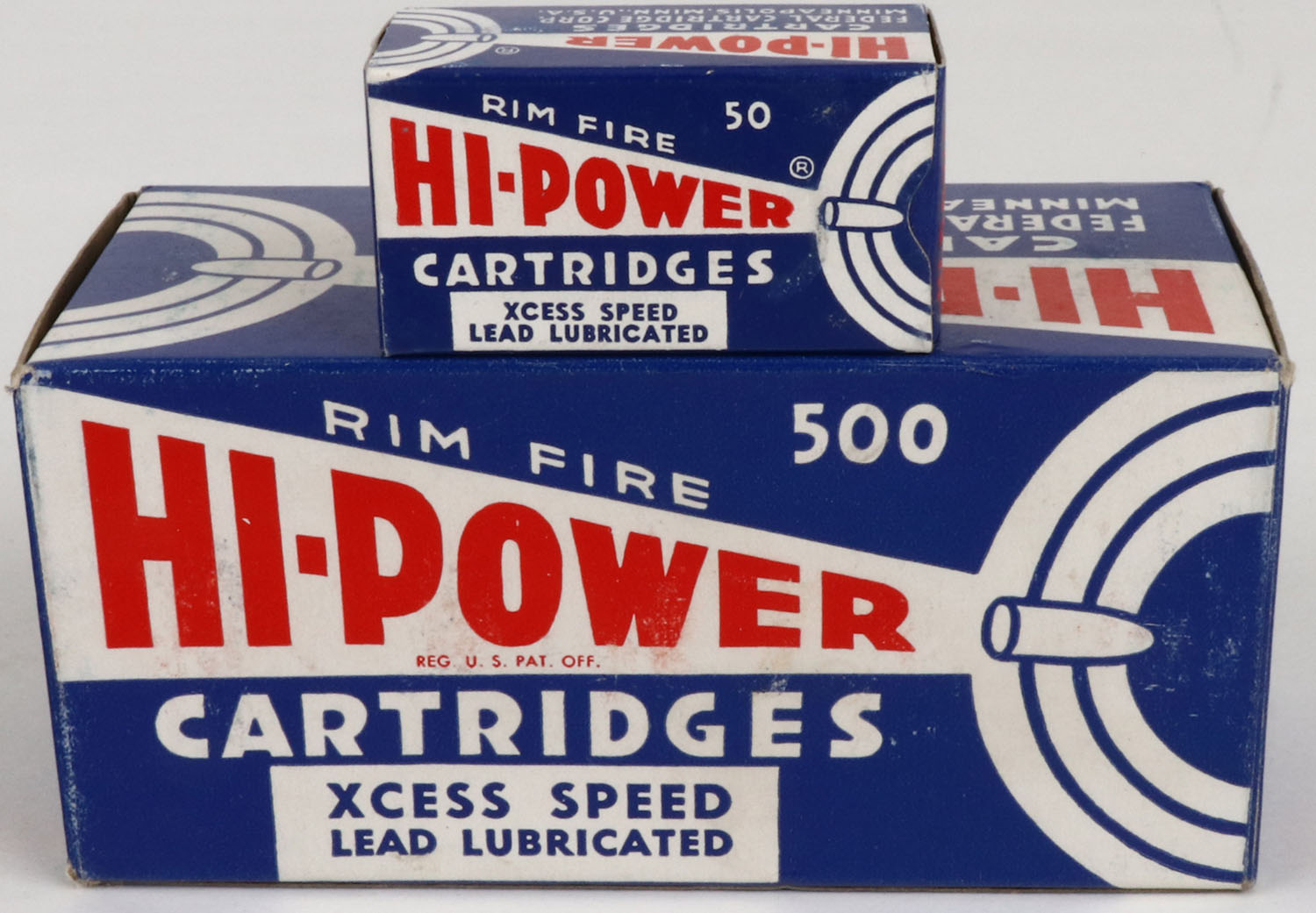Federal, Hi-Power, .22 Long Rifle, Xcess Speed, Full, 500rds. 1pc. Blue white & red brick, brick is solid with excellent to minty color, only very minor shelf & corner wear, edges are mostly crisp, end flaps are rigid, inside boxes are minty. Grade: Excellent ++ - Value: 40 to 120