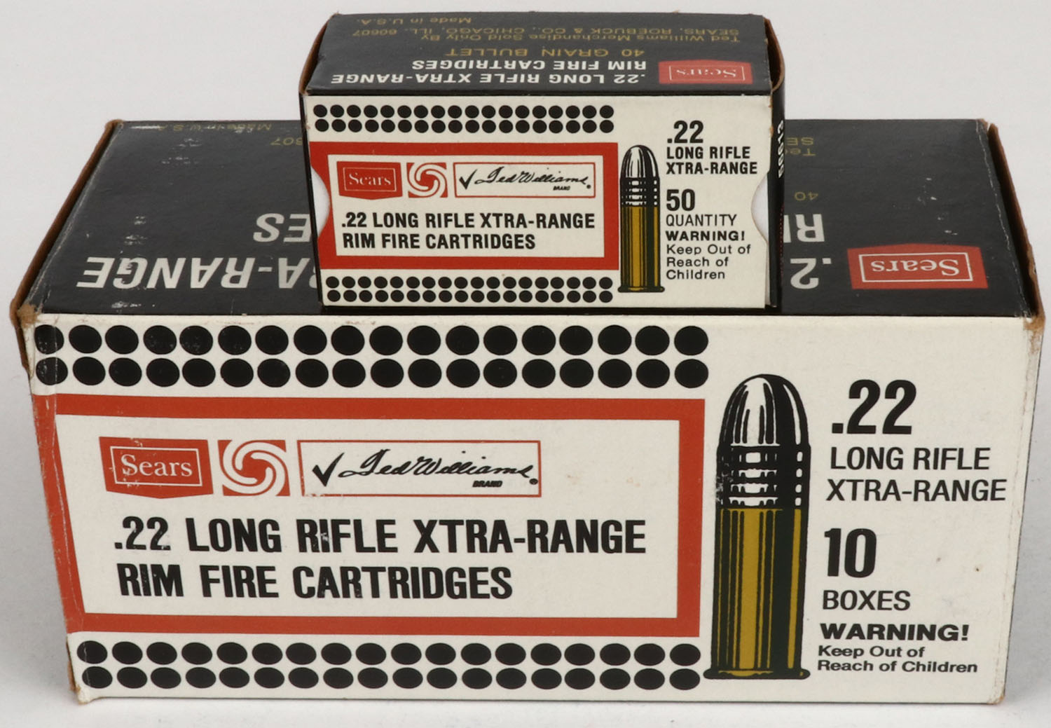 Sears, Xtra-Range, .22 Long Rifle, 1pc. Full, 500rds. Black white & red brick, brick is solid with excellent color, very minor corner wear, edges are crisp, end flaps are rigid, inside boxes are minty. Grade: Excellent ++ - Value: 40 to 120