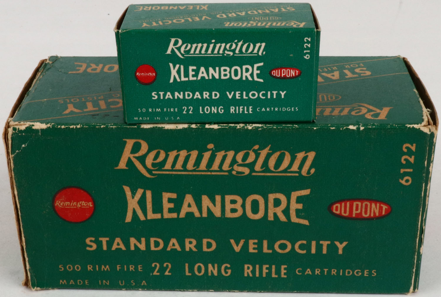 Remington, Kleanbore, .22 Long Rifle, Standard Velocity, 6122, Full, 500rds. 1pc. Green & white brick, brick is solid with very good to excellent color, very minor age soiling, some edge & corner wear, end flaps are solid, inside boxes are minty. Grade: Excellent + - Value: 30 to 120
