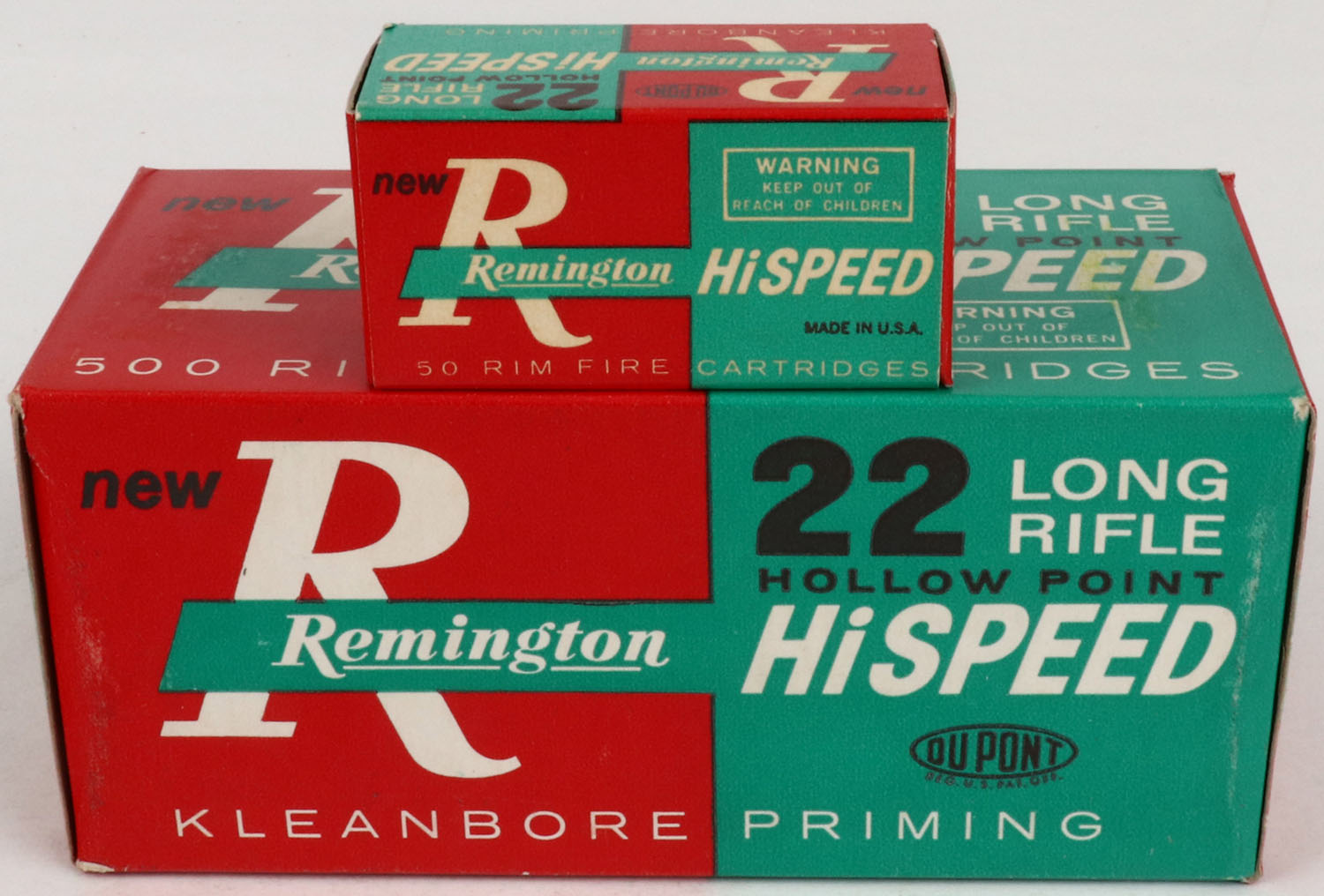Remington, Hi-Speed, .22 Long Rifle Hollow Point, Full, 500rds. 1pc. Red green & white brick, brick is solid with excellent color, very minor soiling, very minor shelf & corner wear, edges are crisp, end flaps are solid, inside boxes are mint. Grade: Excellent ++ - Value: 30 to 120
