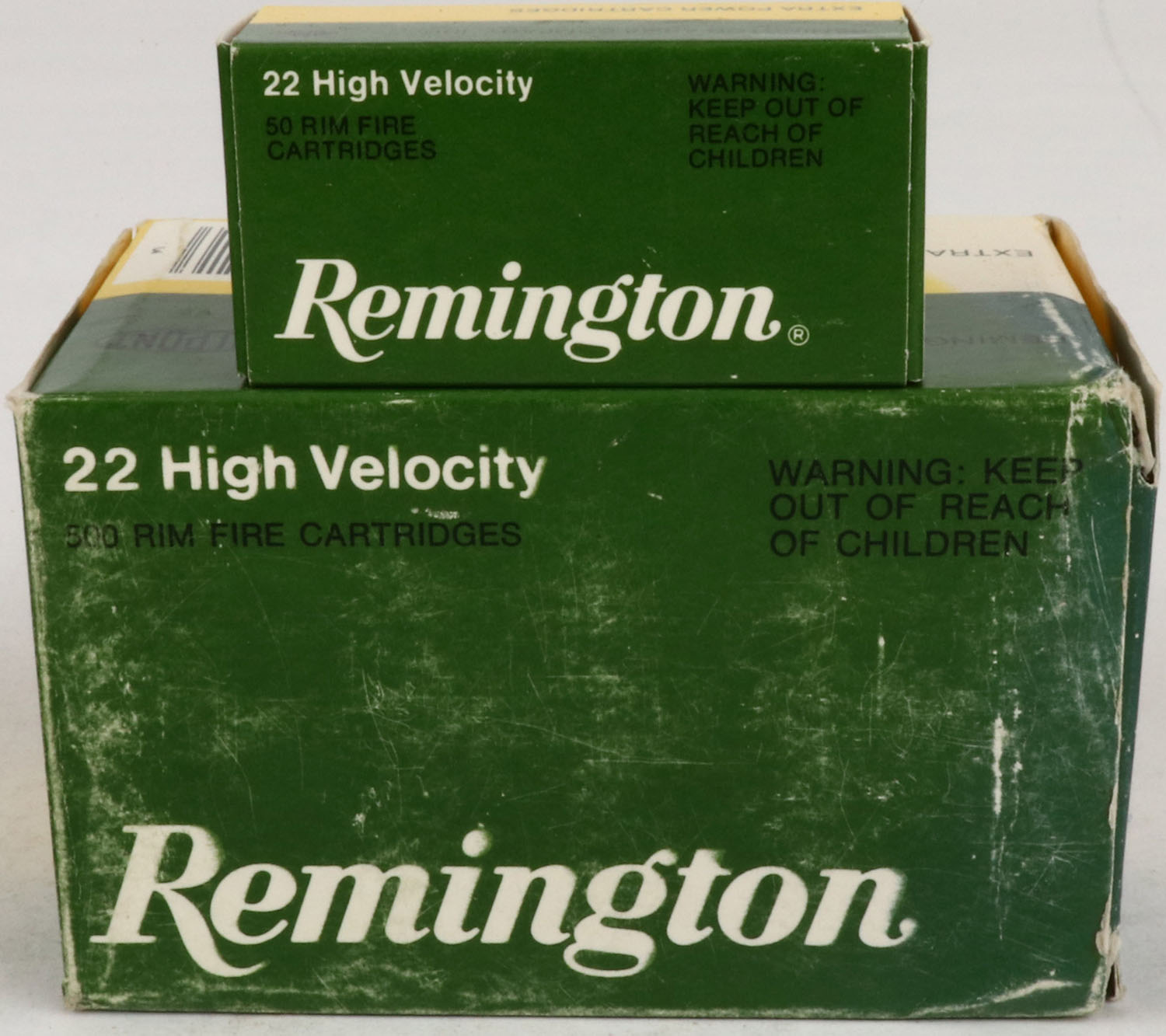 Remington, High Velocity, .22 Short Hollow Point, Partial 8 Boxes, 1pc. Green & yellow brick, brick is solid with very good color, color fading, shelf wear, minor edge & corner wear, end flaps are solid, inside boxes are minty. Grade: Excellent + - Value: 30 to 120