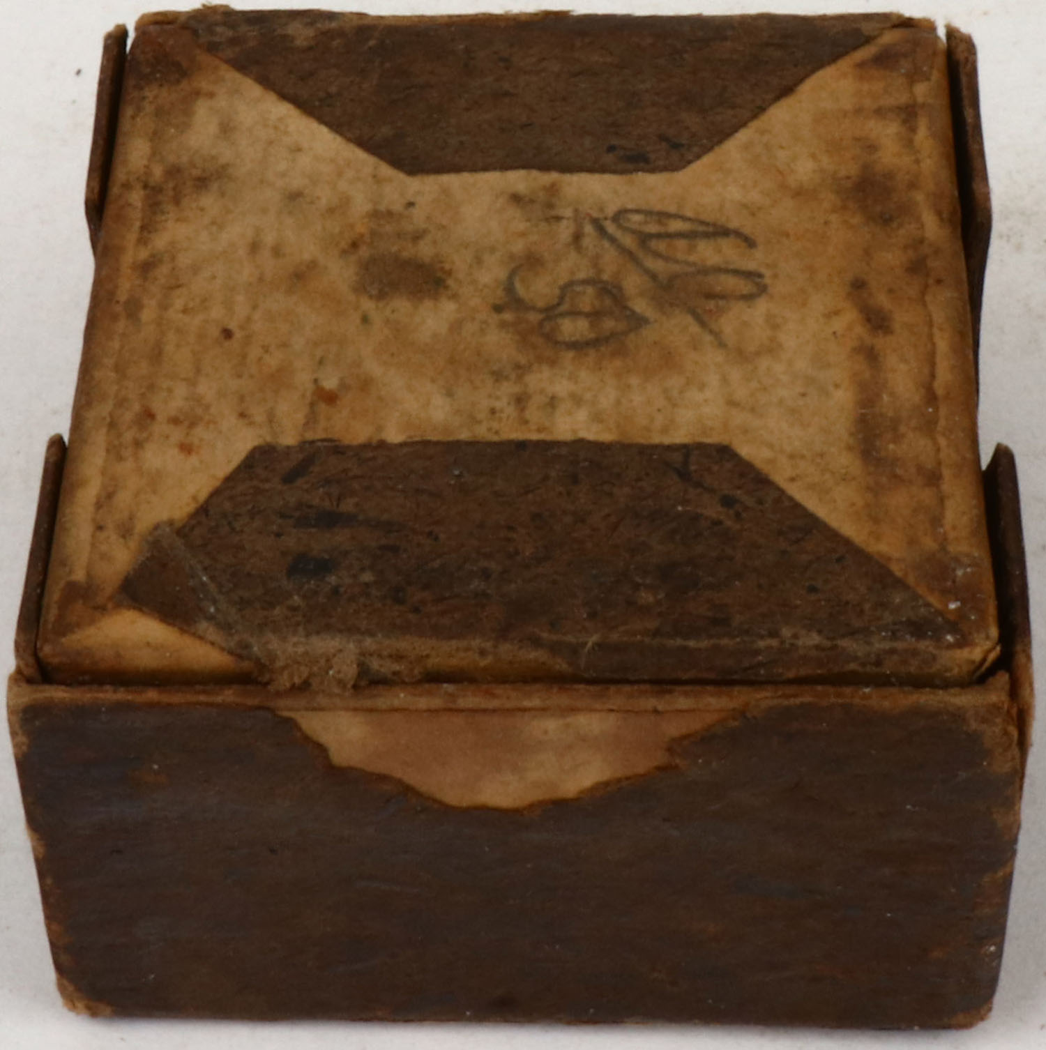 American Metallic Cartridge Co., .38 Short R.F. Shot Cartridges, Partial 14rds., 2pc. Brown box with buff labels, box is solid with very good color, age soiling, lid has 2 seam splits, some edge & corner wear, ammo is good. (724b) Grade: Very Good - Value: 10 to 100