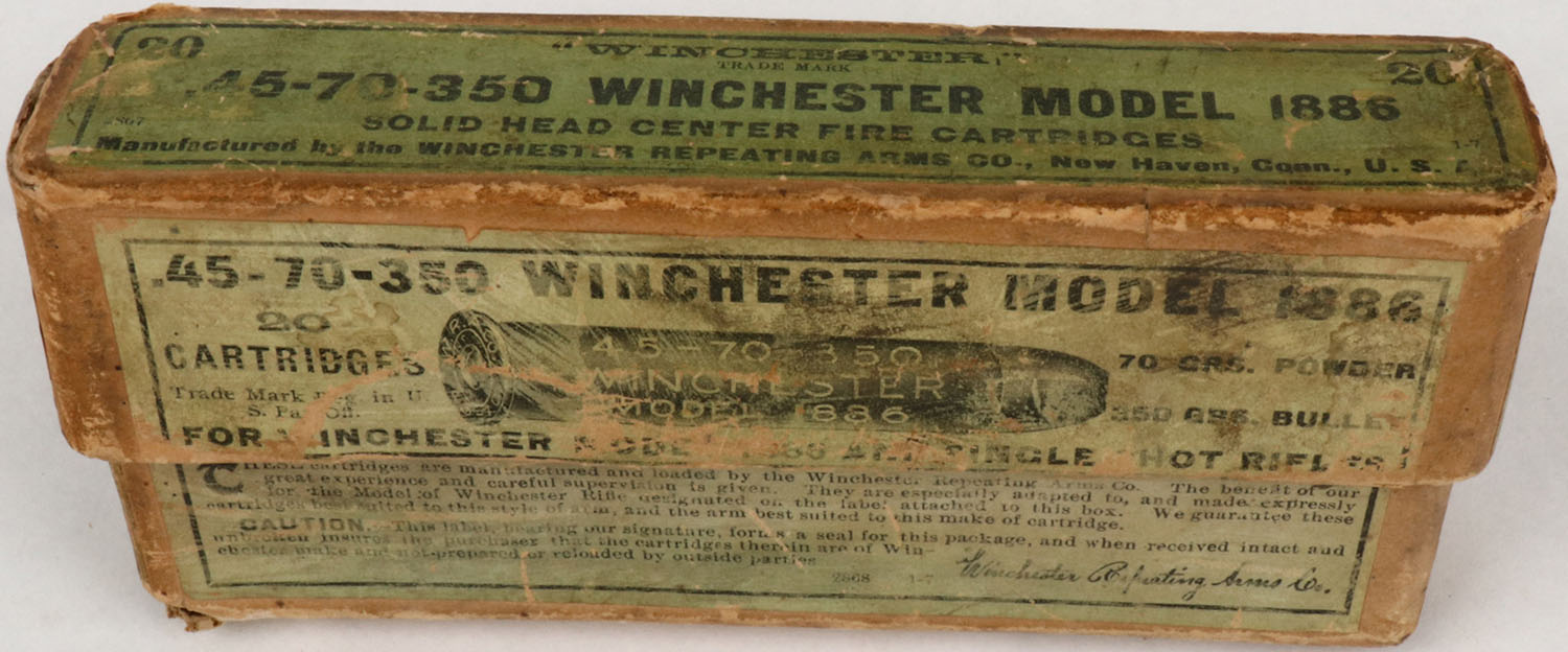 Winchester, .45-70-350 Winchester Model 1886, Full of incorrect ammo, 2pc. Buff box, with green labels, box is solid with good to very good color, age soiling, scuffing, seam split to left corner of lid, edge & corner wear, ammo is excellent. Grade: Very Good + - Value: 10 to 100