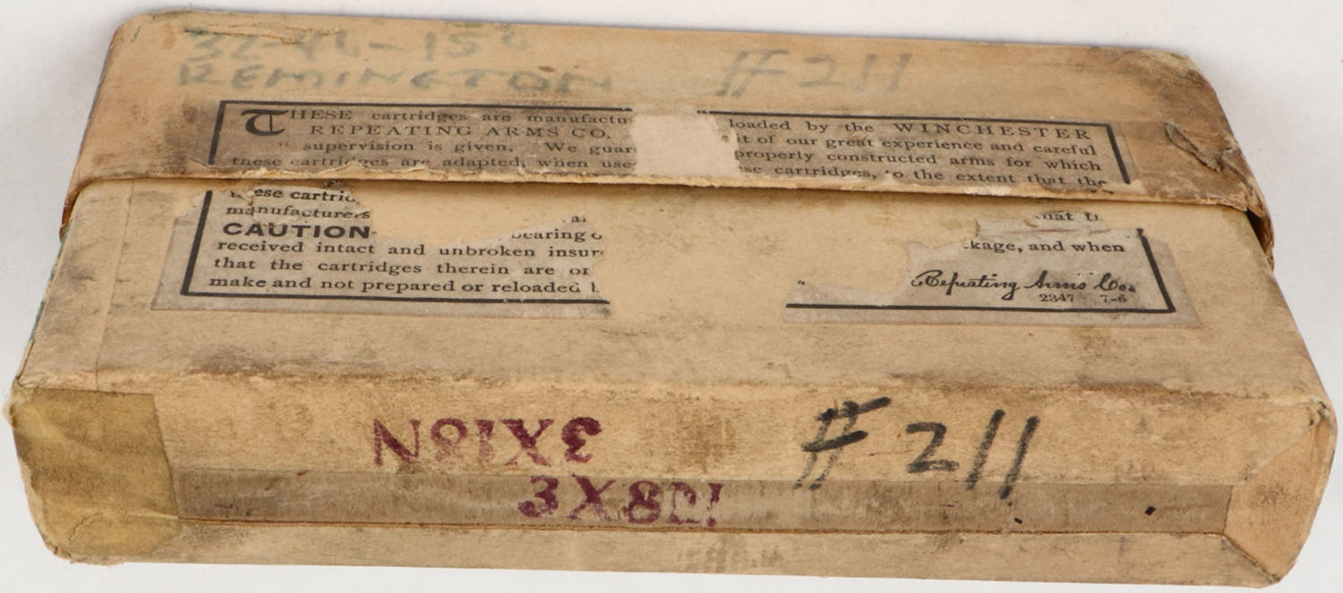Winchester, .40-70-330, for model 1886, 2pc, Full, buff box with green label & black print, box is solid with excellent color, some age soiling, edge wear, scuff to front of box, partial seam split to left side of lid, left end has been written on, ammo is excellent. Grade: Excellent + - Value: 80 to 160