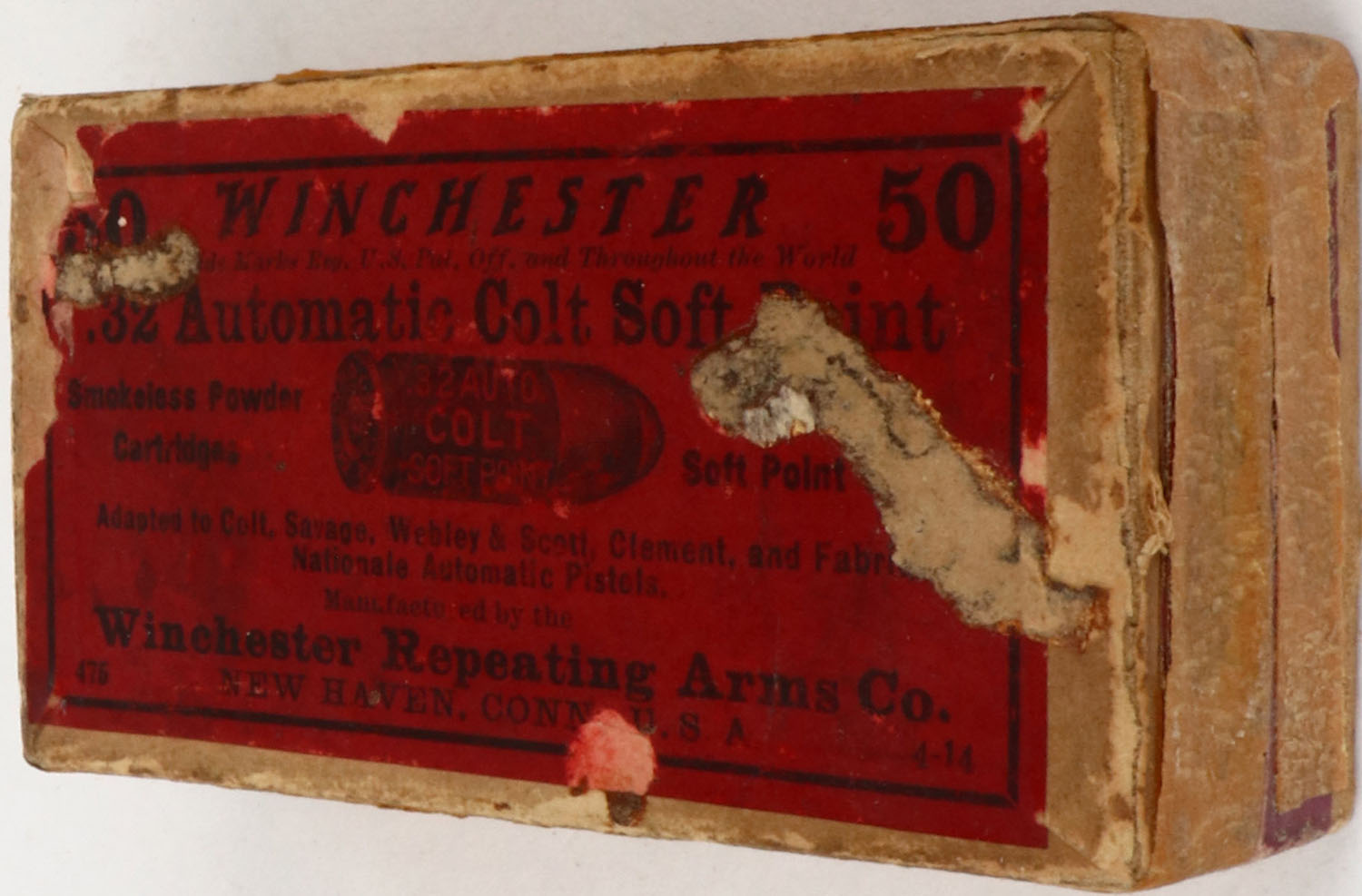 Winchester, .32 Automatic Colt Soft Point, Smokeless Powder Cartridges, Full, 2pc. Buff box with red top label, side sealing label is missing, has 2 Winchester inserts - 1 powder informational insert and 1 Winchester New Rival and Nublack advertisement insert, box is solid with very good to excellent color, age soiling, some tears to top label, edge & corner wear, 3 seam splits to bottom, ammo is very good. Grade: Good ++ - Value: 40 to 200