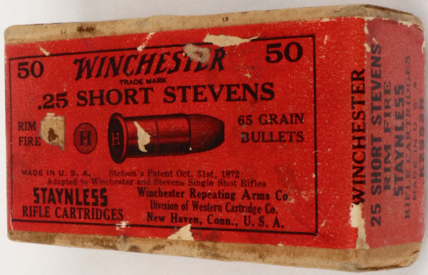 Winchester, .25 Short Stevens Rim Fire, 65 Grain Bullets, Full, 2pc. Buff box with red wraparound label, box is solid with excellent color, shelf wear, minor age soiling, very minor edge & corner wear, labels are 98% intact, ammo is excellent. Grade: Very Good ++ - Value: 50 to 150