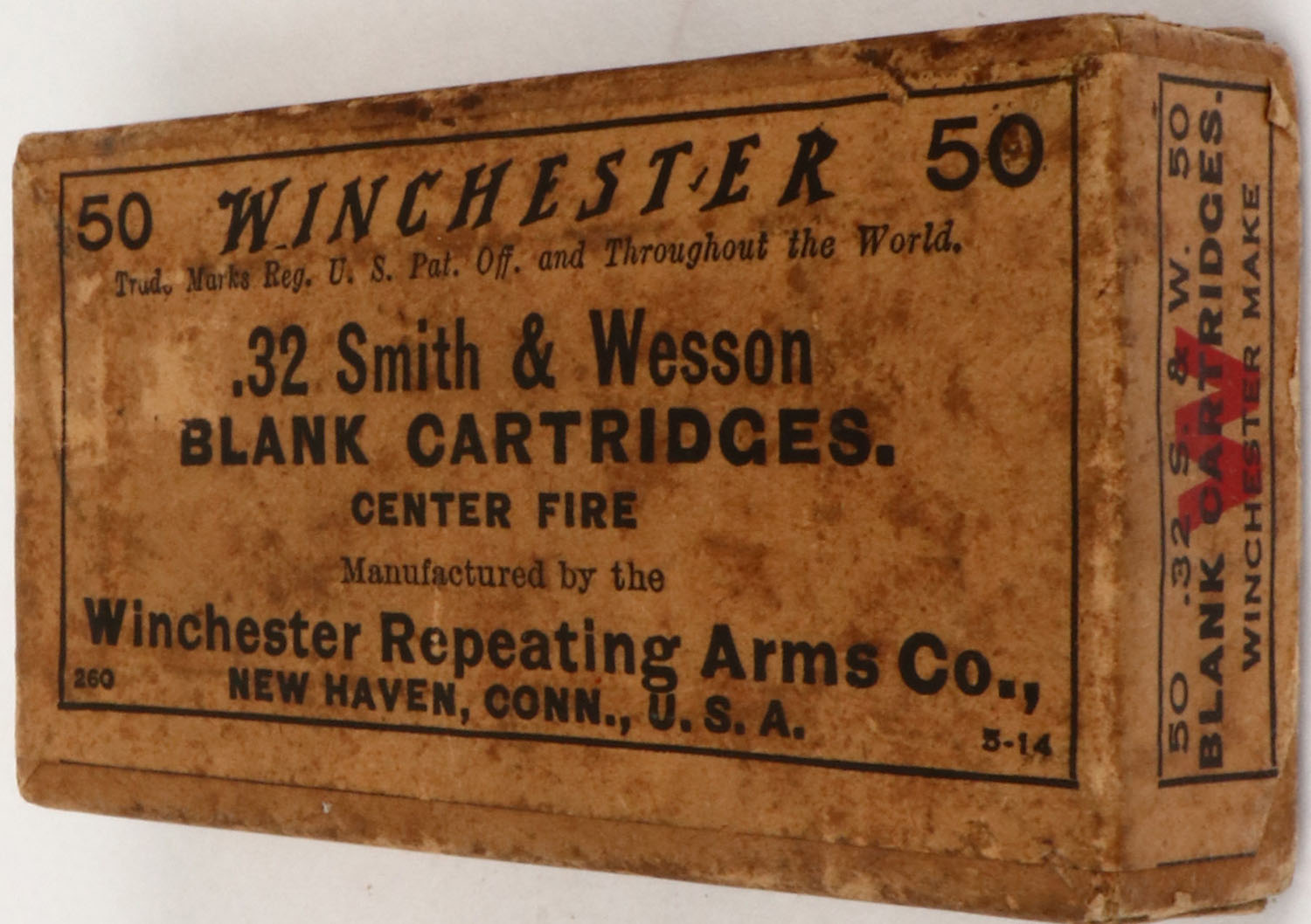 Winchester, .32 Smith & Wesson Blank Cartridges, Center Fire, Partial 25rds., 2pc. Buff box with buff label, box is solid with very good color, age soiling, seam splits on all corners of lid, some edge wear, labels are intact. (129) Grade: Very Good + - Value: 2 to 20