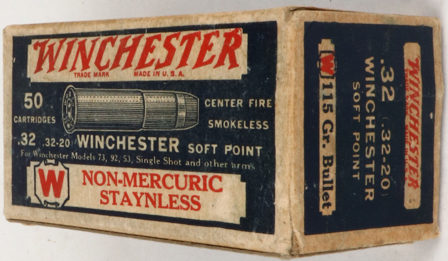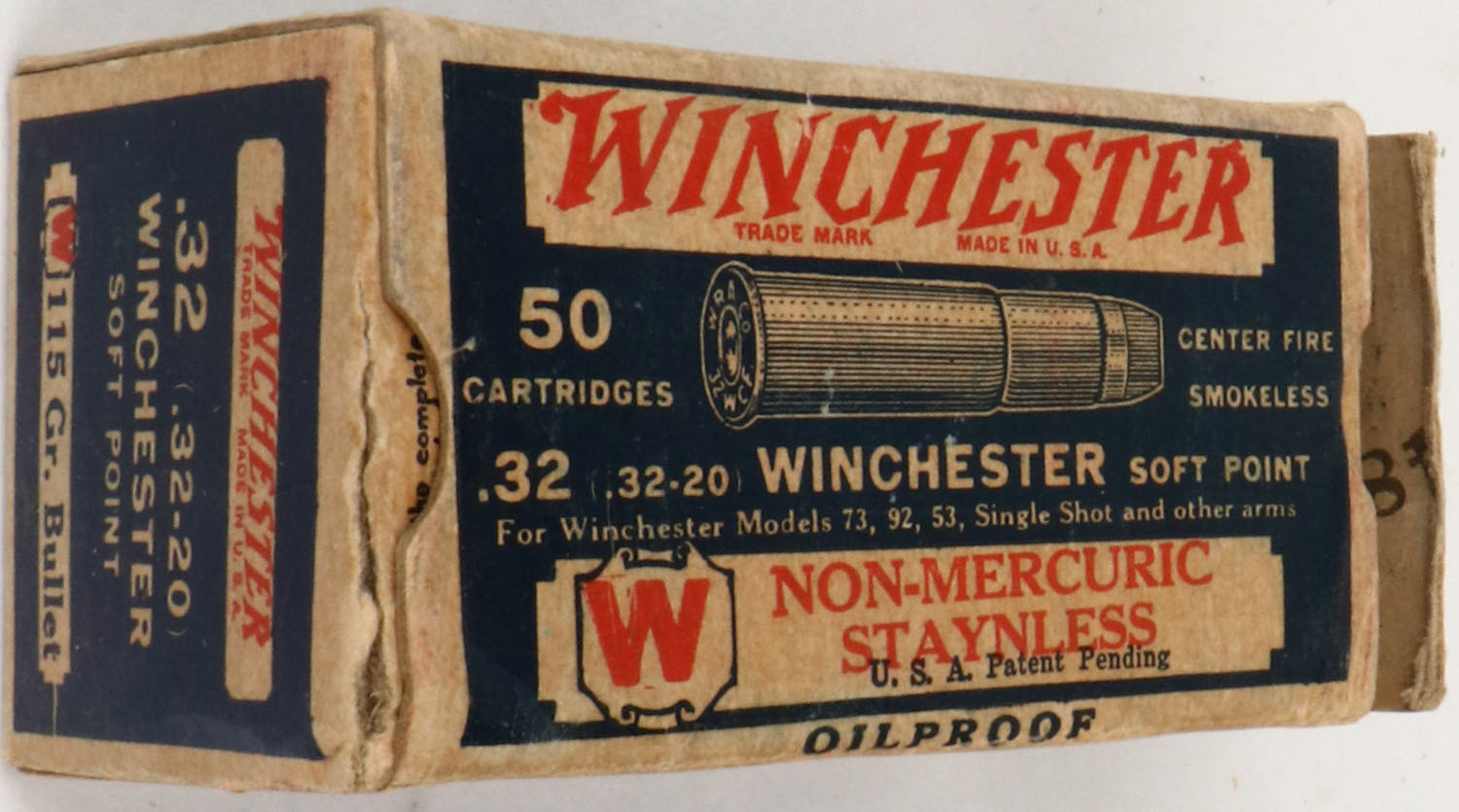 Winchester, Non-Mercuric Staynless, .32 (.32-20) Winchester, Soft Point, Oilproof, Partial 46rds., Blue white & red box, box is solid with excellent color, some age soiling, insert tab is torn off of right end flap, partial tear to left end flap, minor corner wear, edges are mostly crisp, ammo is excellent. Grade: Very Good + - Value: 40 to 200