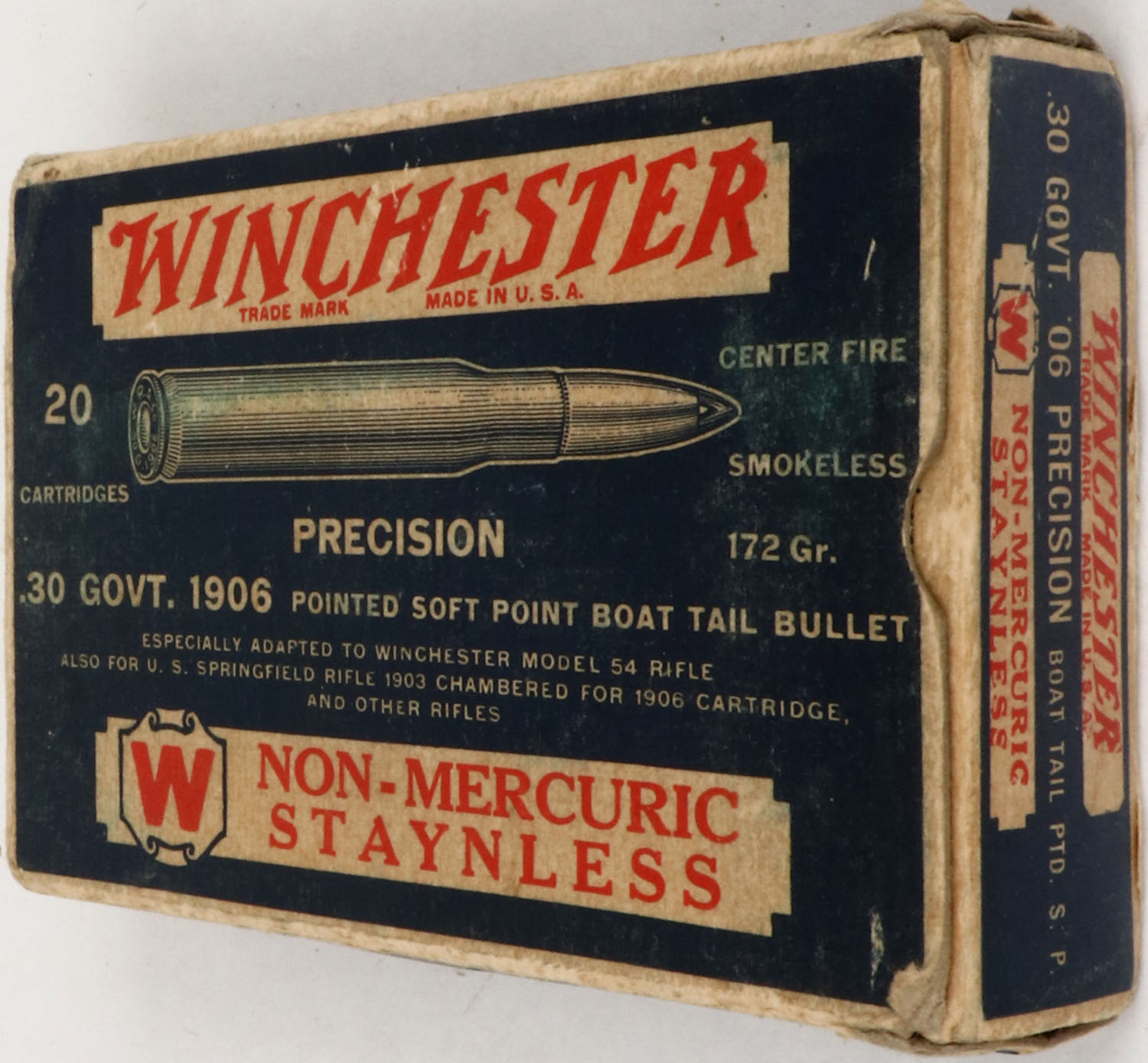 Winchester, Non-Mercuric Staynless, .30 Govt. 1906 (.30-06) Precision, Pointed Soft Point Boat Tail Bullet, Full, 1pc. Blue white & red box, box is solid with excellent color, some age soiling, minor edge & corner wear, end flaps are solid, ammo is excellent. Grade: Very Good ++ - Value: 30 to 60