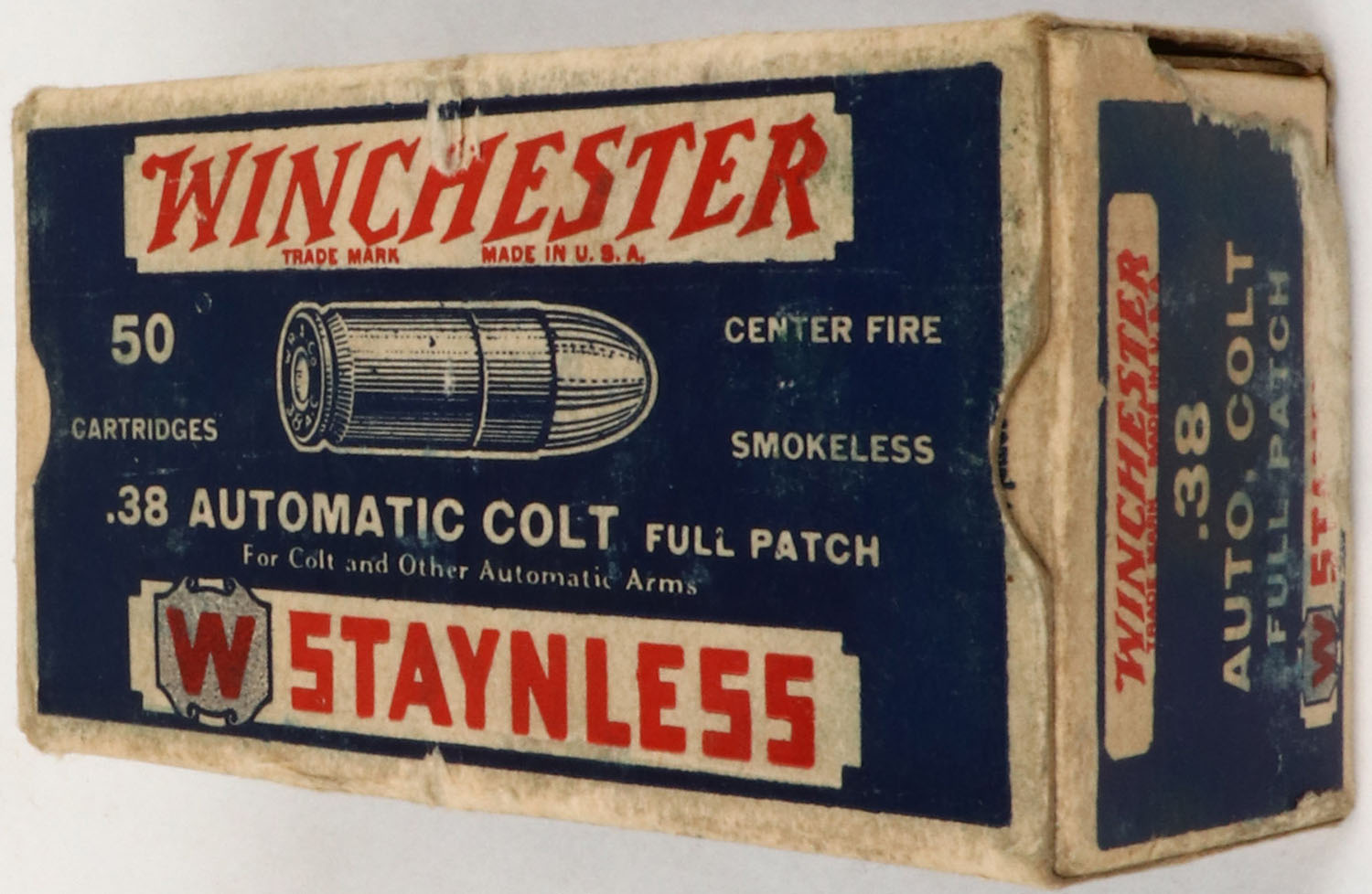 Winchester,. Staynless, .38 Automatic Colt, Full, 1pc., blue white & red box, box is solid with excellent color, very minor age soiling & shelf wear, very minor edge & corner wear, end flaps are solid, ammo is excellent. (1464) Grade: Excellent - Value: 20 to 60