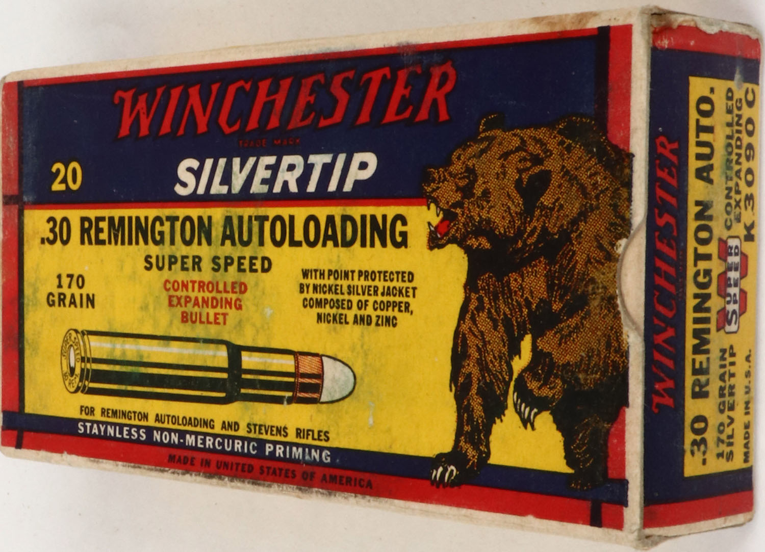 Winchester, Silvertip, .30 Remington Autoloading, 170 Grain Controlled Expanding Bullet, Full, 1pc. Yellow blue & red Bear Box, box is solid with excellent color, very minor age soiling & corner wear, some shelf wear, edges are mostly crisp, end flaps are solid, ammo is excellent. Grade: Excellent - Value: 100 to 300