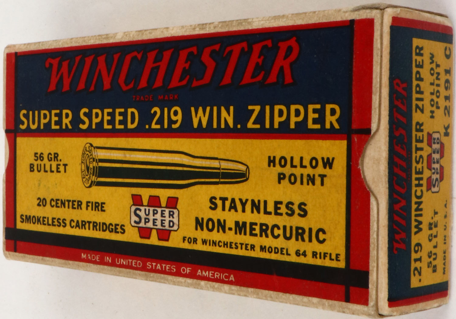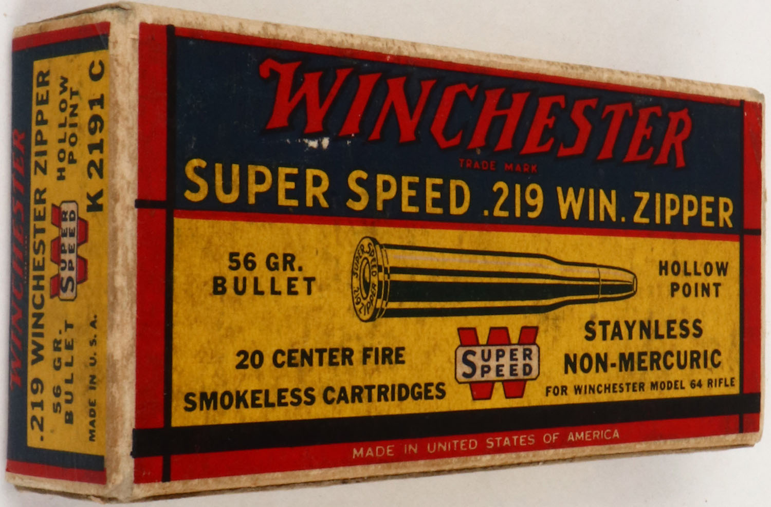 Winchester, Super Speed, .219 Win. Zipper, 56 Gr. Hollow Point Bullet, Full, 1pc. Yellow blue & red box, box is solid with excellent color, minor age soiling, very minor edge & corner wear, end flaps are solid, ammo is excellent. Grade: Excellent - Value: 200 to 600