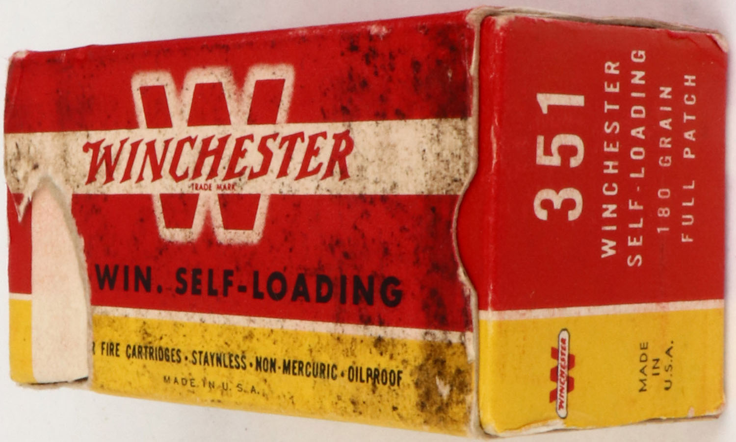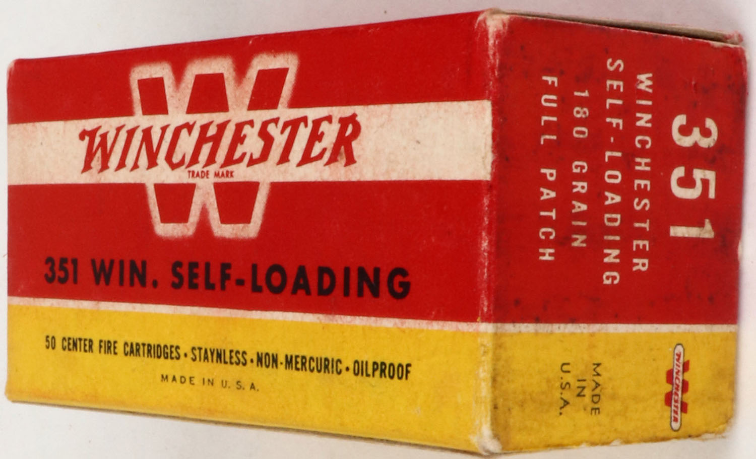 Winchester, .351 Win. Self-Loading, 180 Grain Full Patch, Full, 1pc. Red yellow & white box, box is solid with excellent color, staining on top, tear on top, minor corner wear, very minor age soiling, edges are somewhat crisp, end flaps are solid, ammo is excellent. Grade: Very Good + - Value: 50 to 250