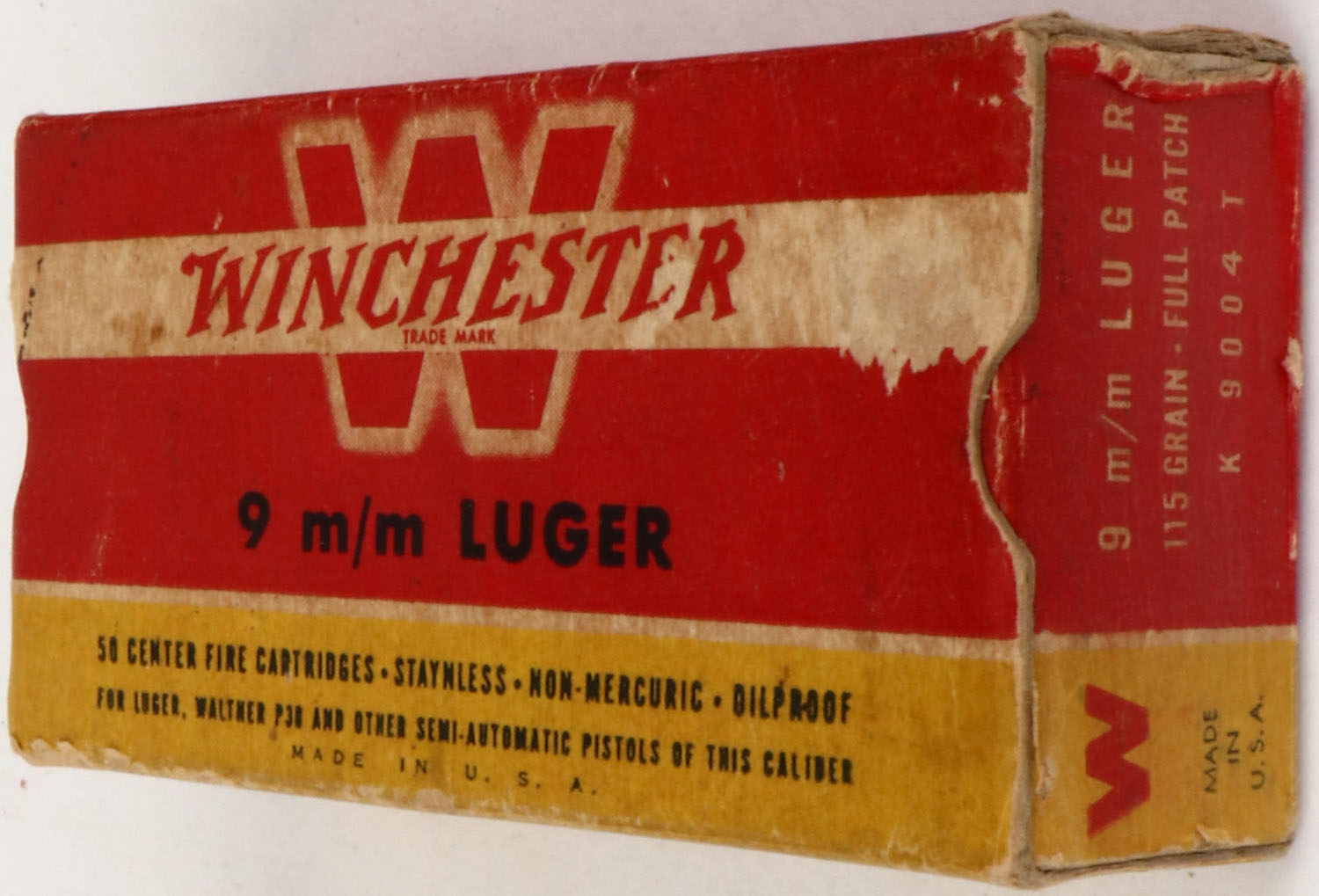 Winchester, 9mm Luger, 115 Grain Full Patch, Partial 45rds. 1pc. Red yellow & white box, box is solid with very good to excellent color, age soiling, very minor edge & corner wear, end flaps are solid, ammo is excellent. (141) Grade: Very Good ++ - Value: 10 to 40