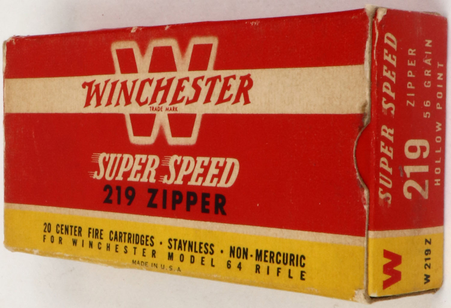 Winchester, Super Speed, .219 Zipper, 56 Grain Hollow Point, Full, 1pc. Red yellow & white box, box is solid with excellent color, some age soiling, minor edge & corner wear, small stain on top, end flaps are solid, ammo is excellent to minty. Grade: Excellent - Value: 100 to 200
