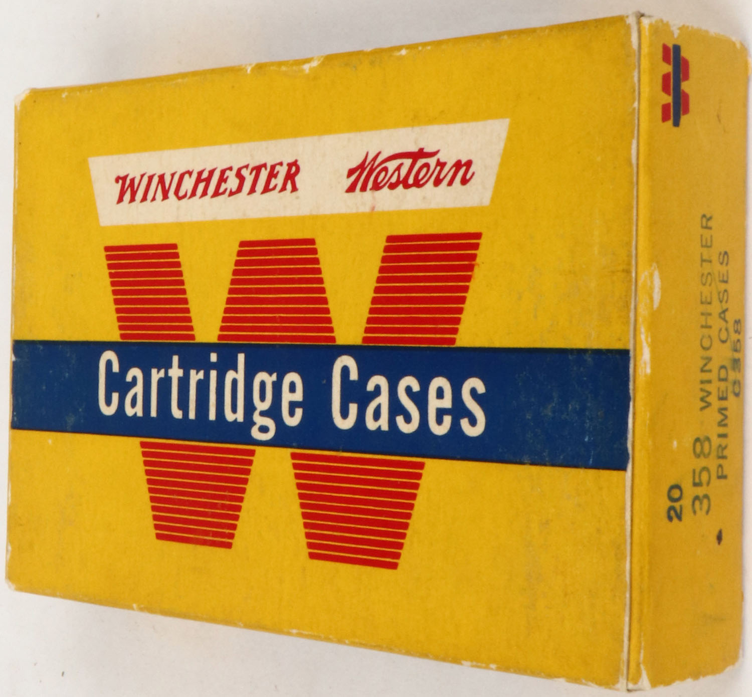 Winchester, Cartridge Cases, .358 Winchester Primed Cases, Full, 1pc. Yellow red & blue box, box is solid with excellent color, minor age soiling, very minor corner wear, edges are mostly crisp, end flaps are solid, ammo is excellent to minty. Grade: Excellent - Value: 10 to 50